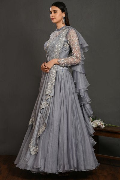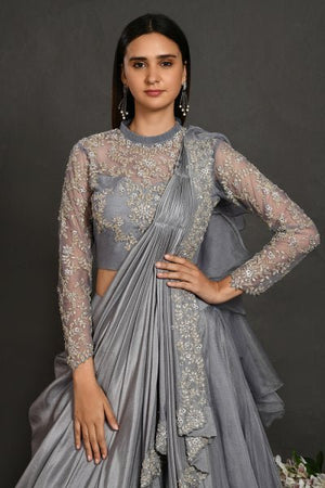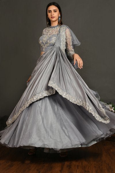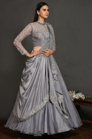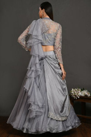 Beautiful gRey lehenga with dupatta. The lehenga is perfect for mehandi and sangeet parties. It is crafted in organza with intrinsic stone and cutdana work. Shop online from Pure Elegance.