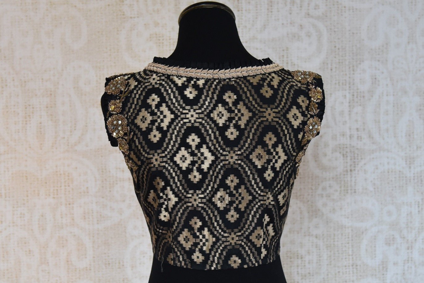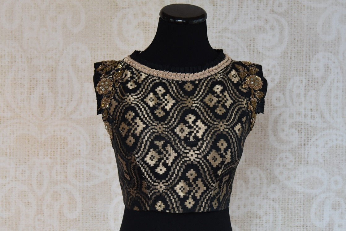The gorgeous black banarasi silk blouse has ethnic print on it. The sleeveless crop top styled blouse looks amazing. Sizes Available 34/36/38/40.