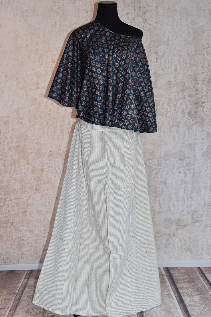 The beautiful pure silk black cape is adorned with ajrakh print and complements the white striped pant. The captivating indo-western dress has a classy look. Sizes Available:- 34/36/38/40.