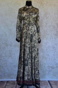 401684 Closed Neck Full Sleeved Off white and Black Silk One Piece Dress