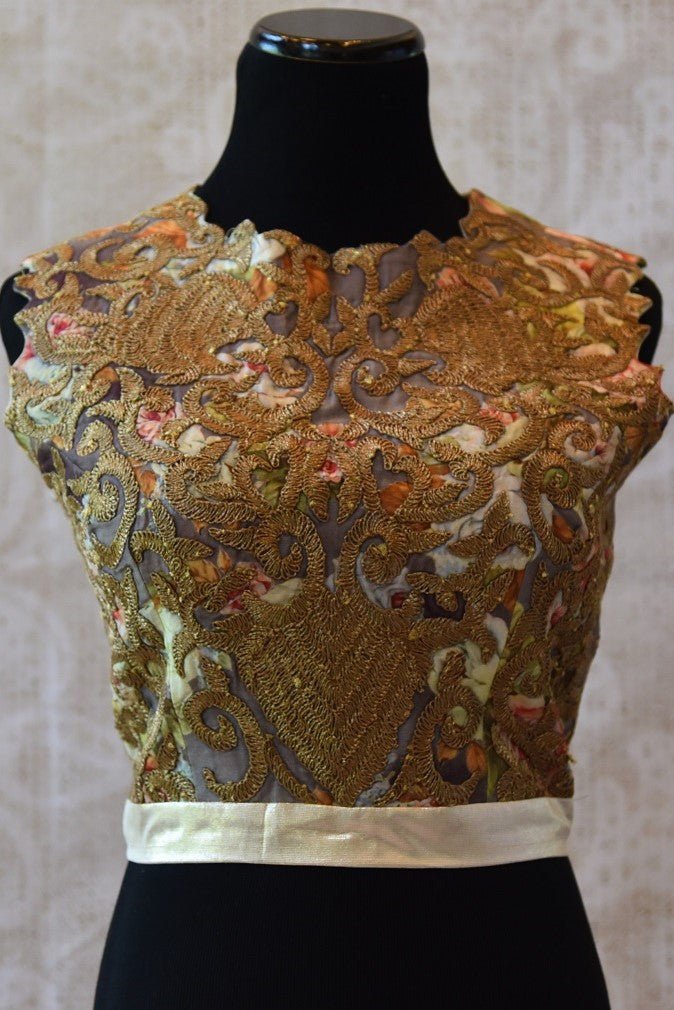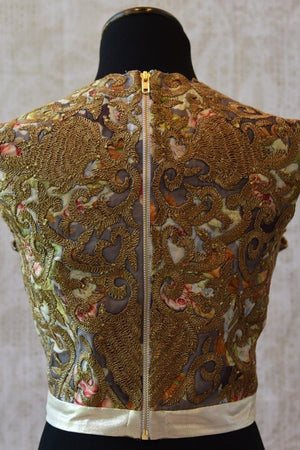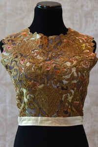 401487 Sleeveless Crop Top Designer Silk Blouse with Gold Embroidery