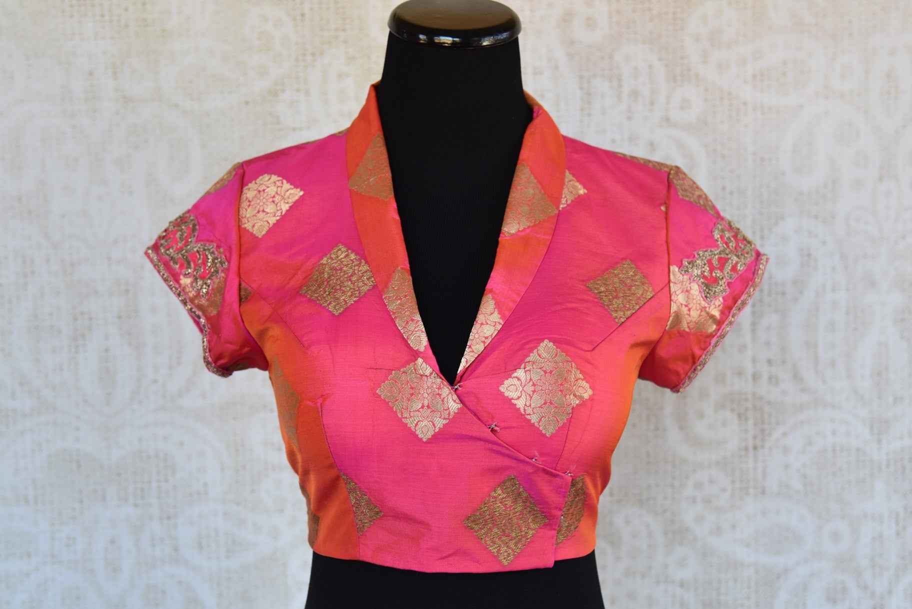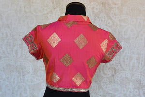 The pink banarasi blouse has beautiful gold embroidered design on it. The V-neck and semi-sleeved blouse is a classy affair. Sizes Available 34/36/38.