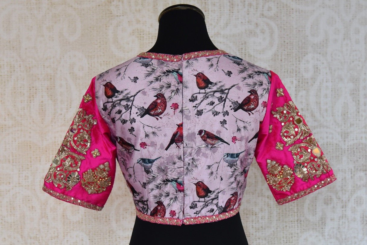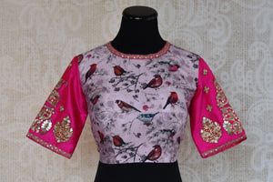 The charming pink and white printed blouse has beautiful embroidery on it. The round neck and half sleeves give a classy look to it. Sizes Available 34/36/38/40.
