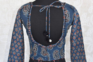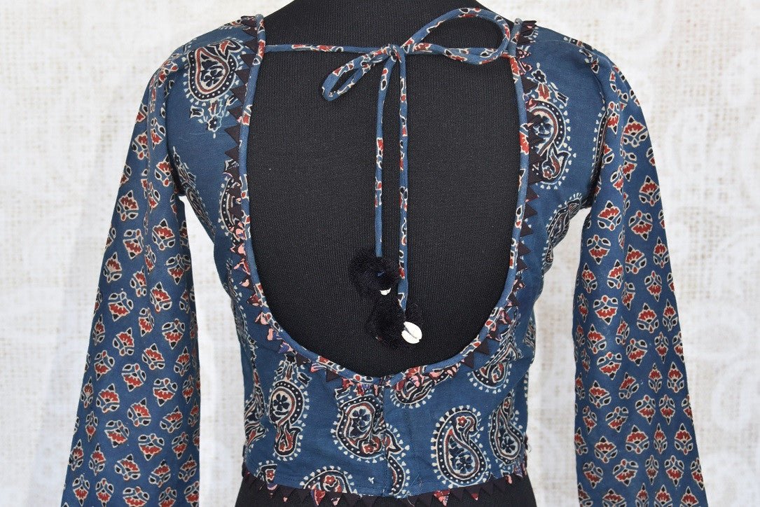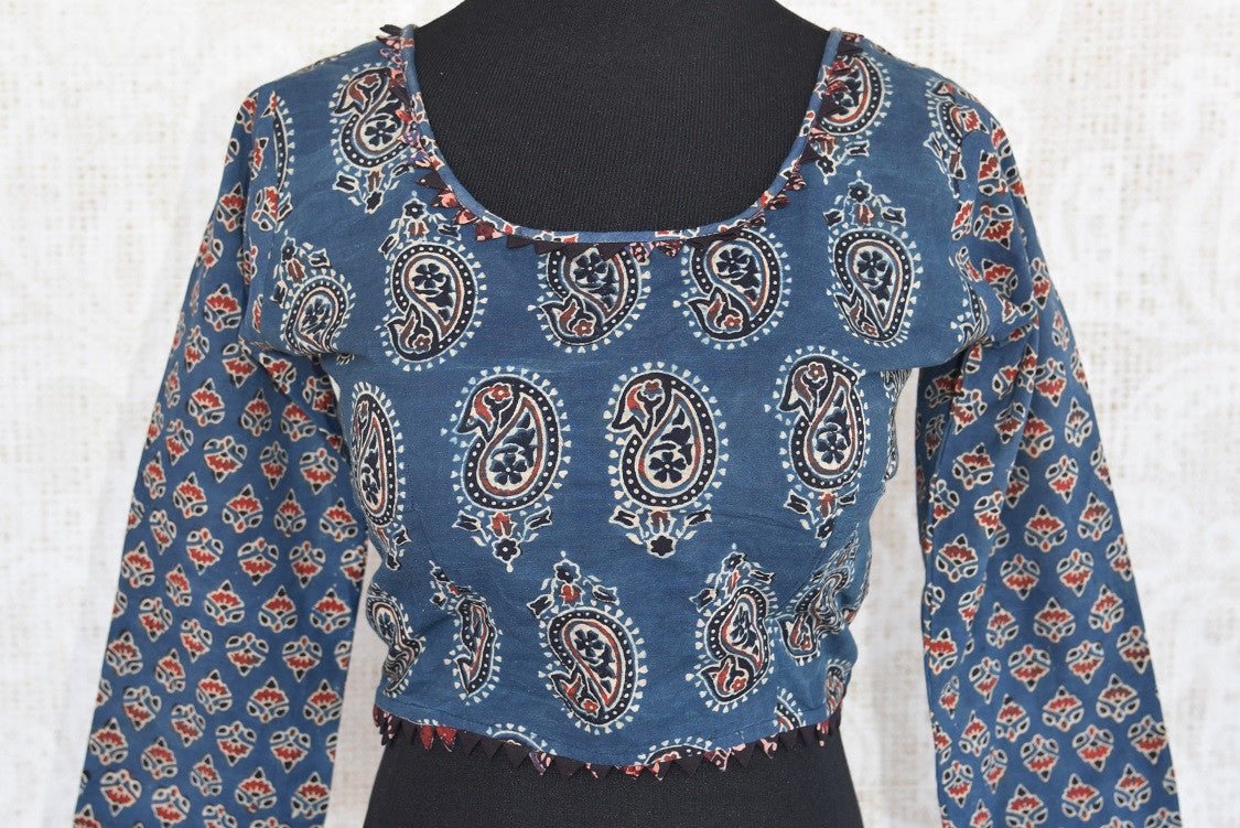 The full sleeved cotton blouse colored in blue looks beautiful with a deep neck and ajrakh print. Sizes Available 34/36/38/40.