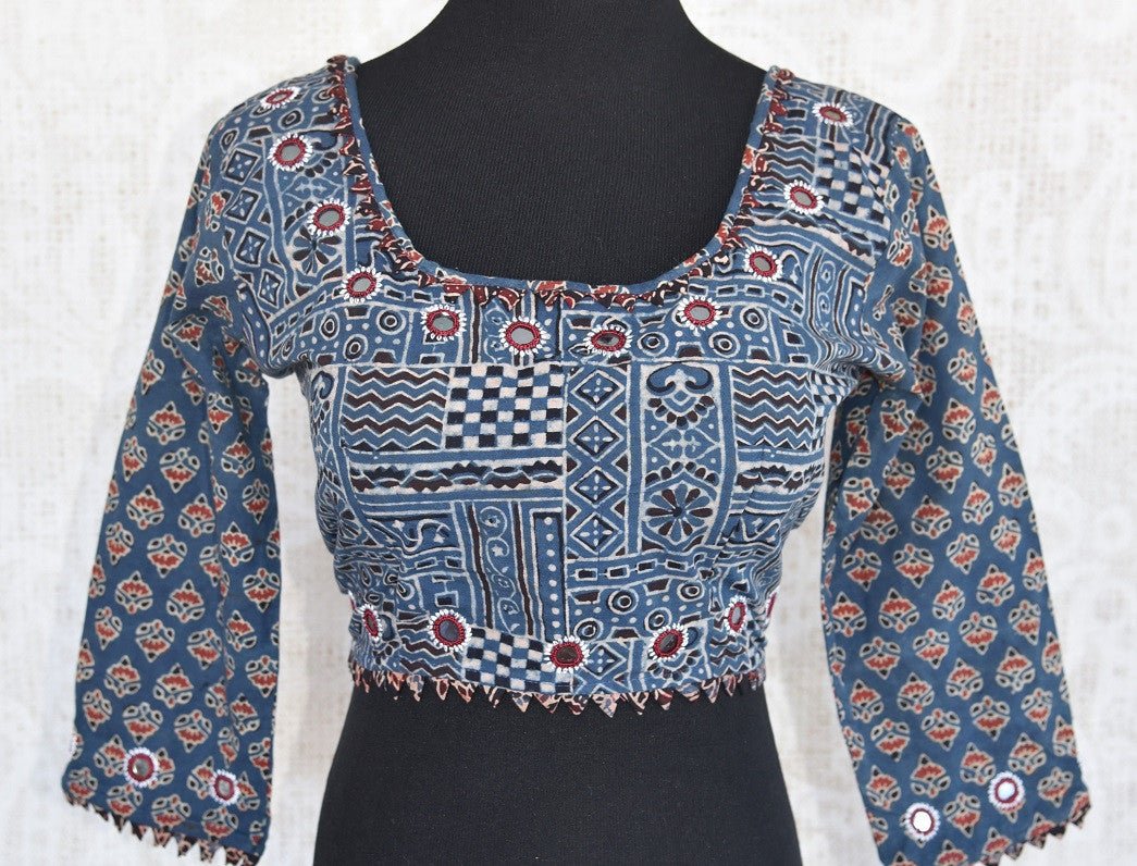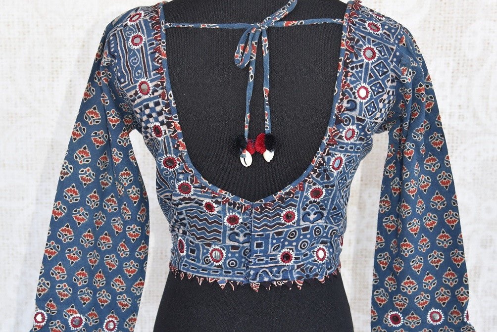 The ethnic cotton blouse has a ravishing ajrakh print that stands out on the deep neck and the full sleeves. It certainly adds glamor to any saree that it is worn with. Sizes Available 34/36/38/40.