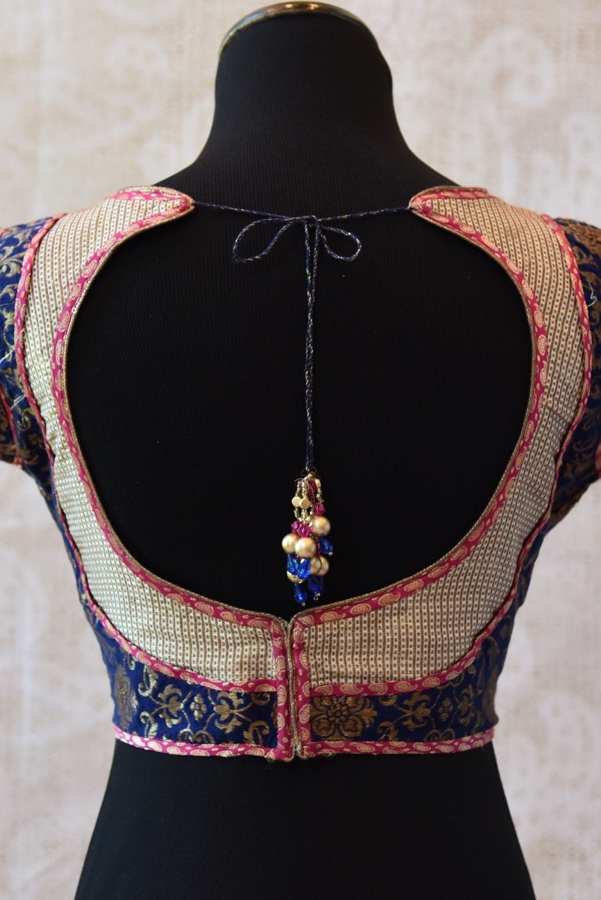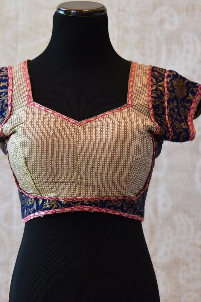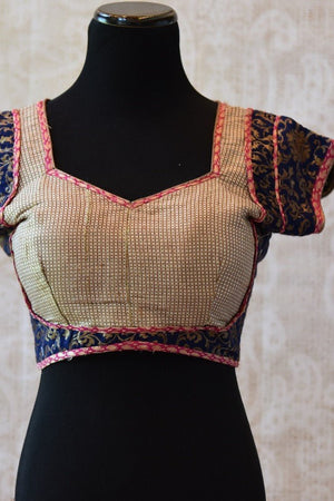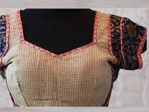 The traditional blouse is dark blue in color with hues of gold and red. The checked cotton silk blouse has brocade detailing and trim. The deep neck adds a ravishing look to it.