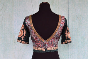 The gorgeous deep neck purple color banarasi blouse has ravishing embroidery on it. It adds glamor to any saree that it is worn with. Sizes Available 34/36/38.