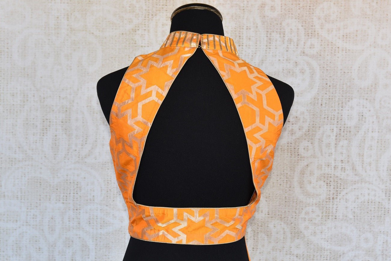 The mesmerizing orange halter-neck designer benarasi blouse is a perfect amalgam of ethnic and fashionable. The back slit gives it a sexy look.