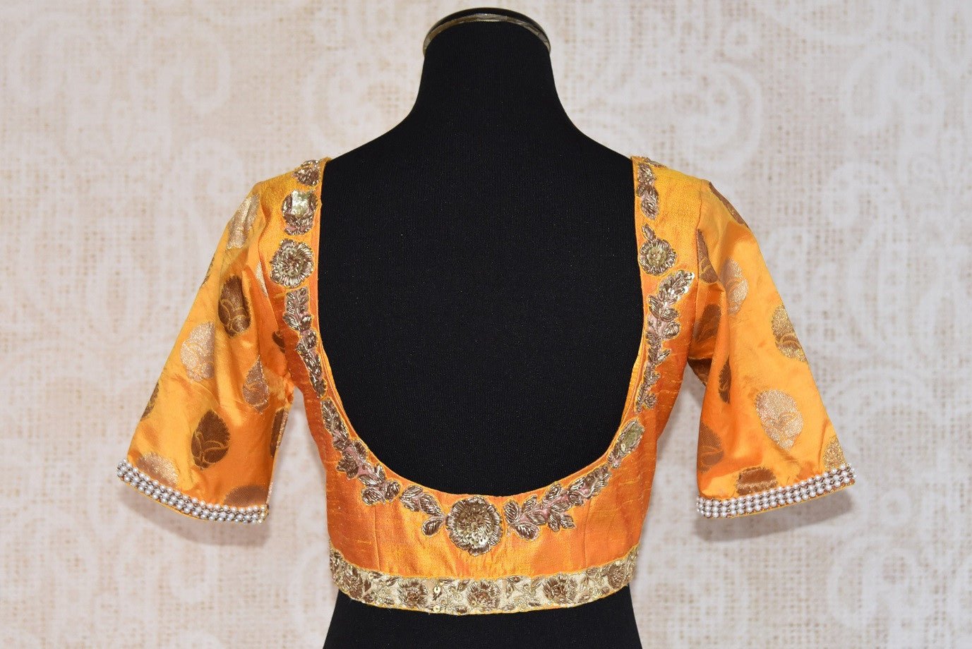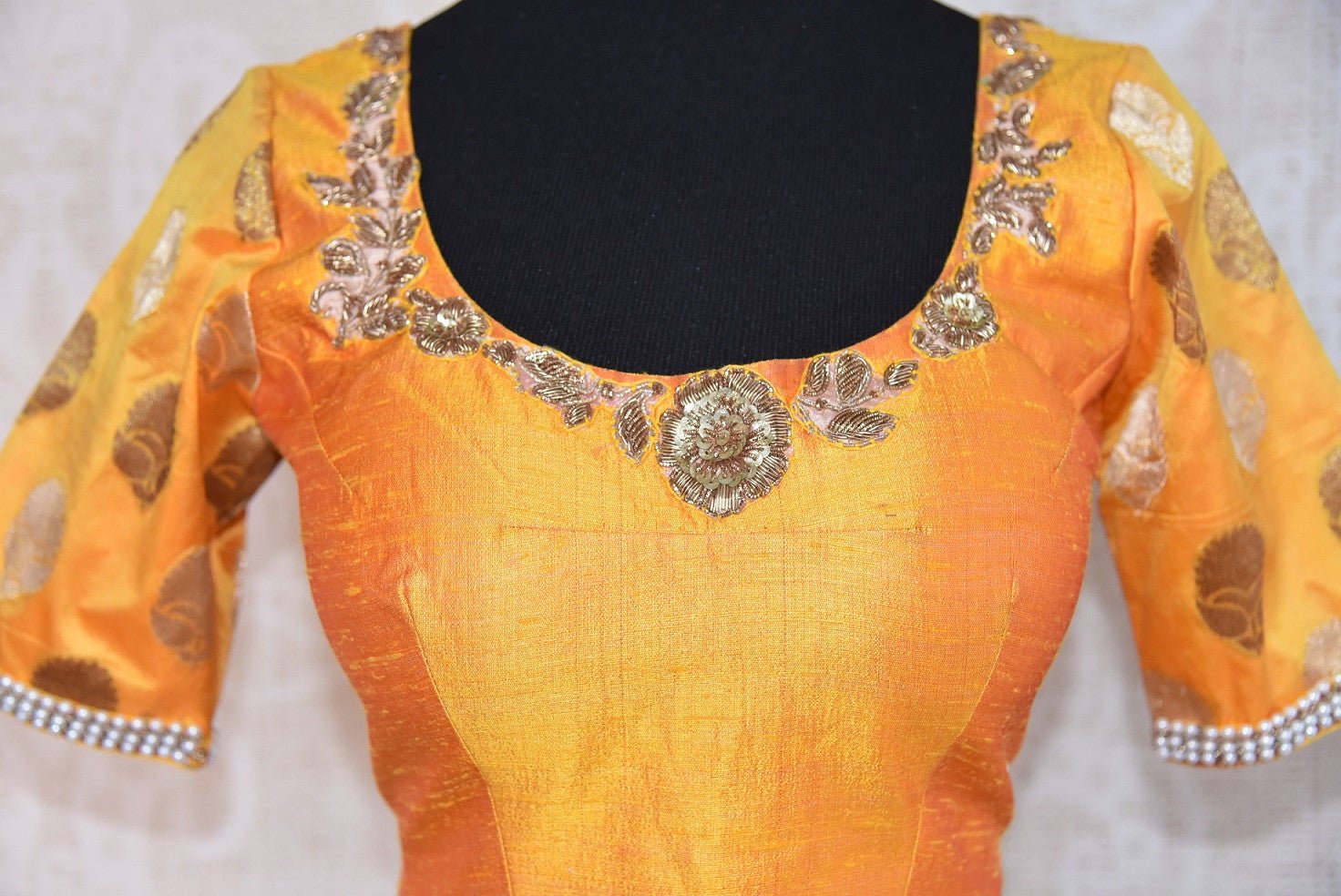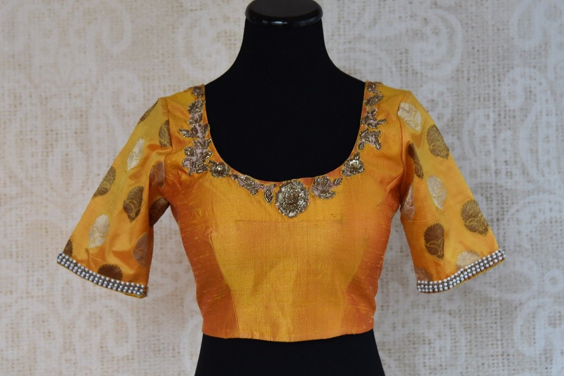 The gorgeous yellow silk blouse has beautiful embroidery throughout the neck and arms. The deep neck makes it look sexy. Sizes Available 34/36/38/40.