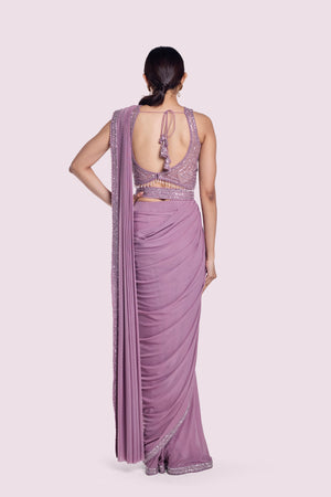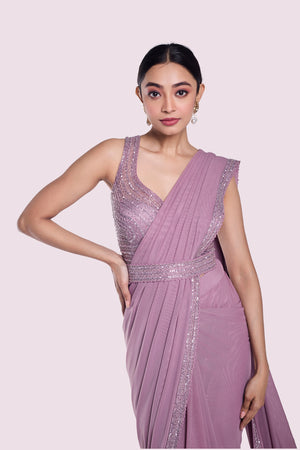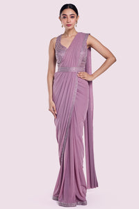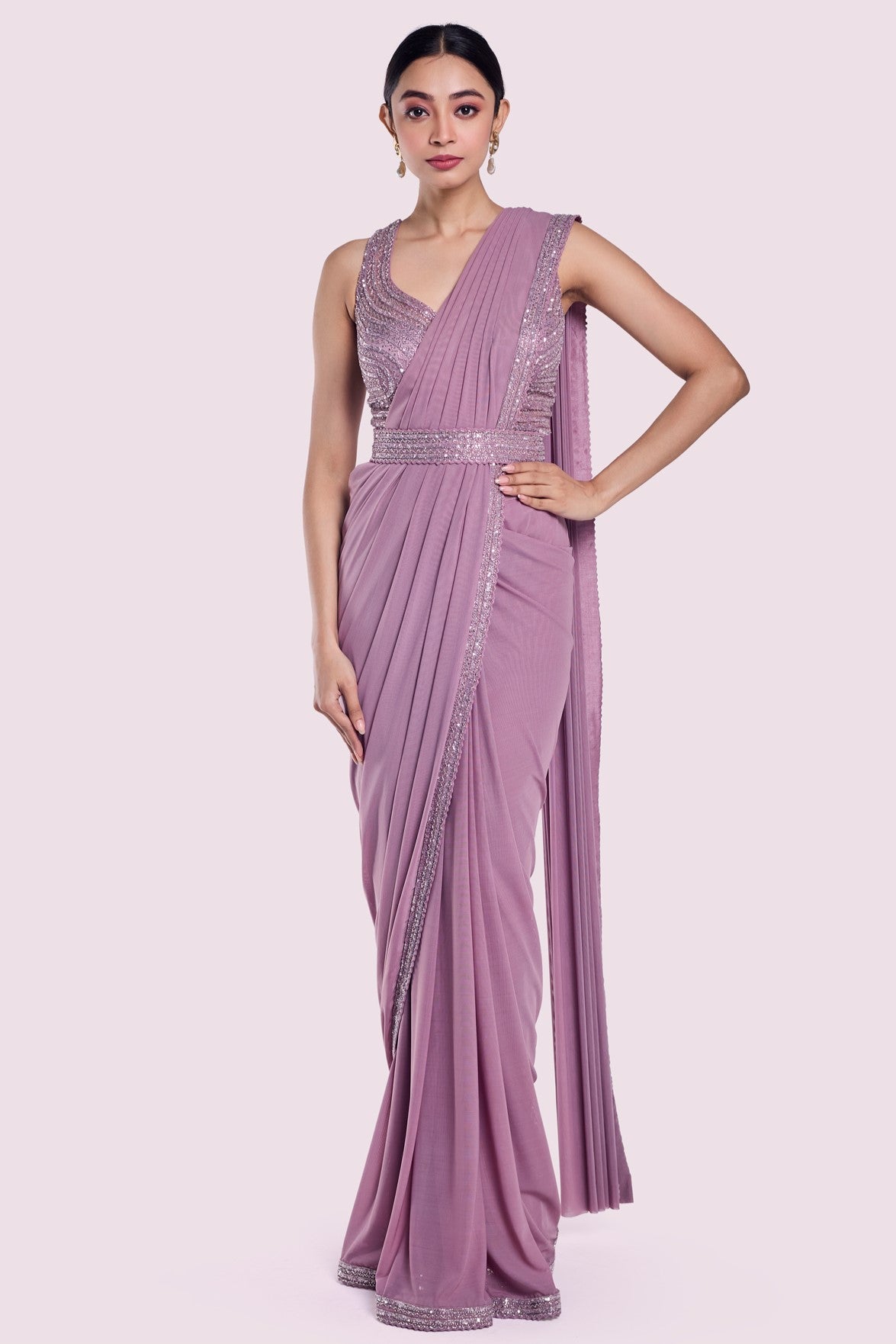Beautiful lavender pre-stitched lycra net saree for weddings and special occasions! It comes with an embellished saree blouse. Shop designer saris online in the USA from Pure Elegance.