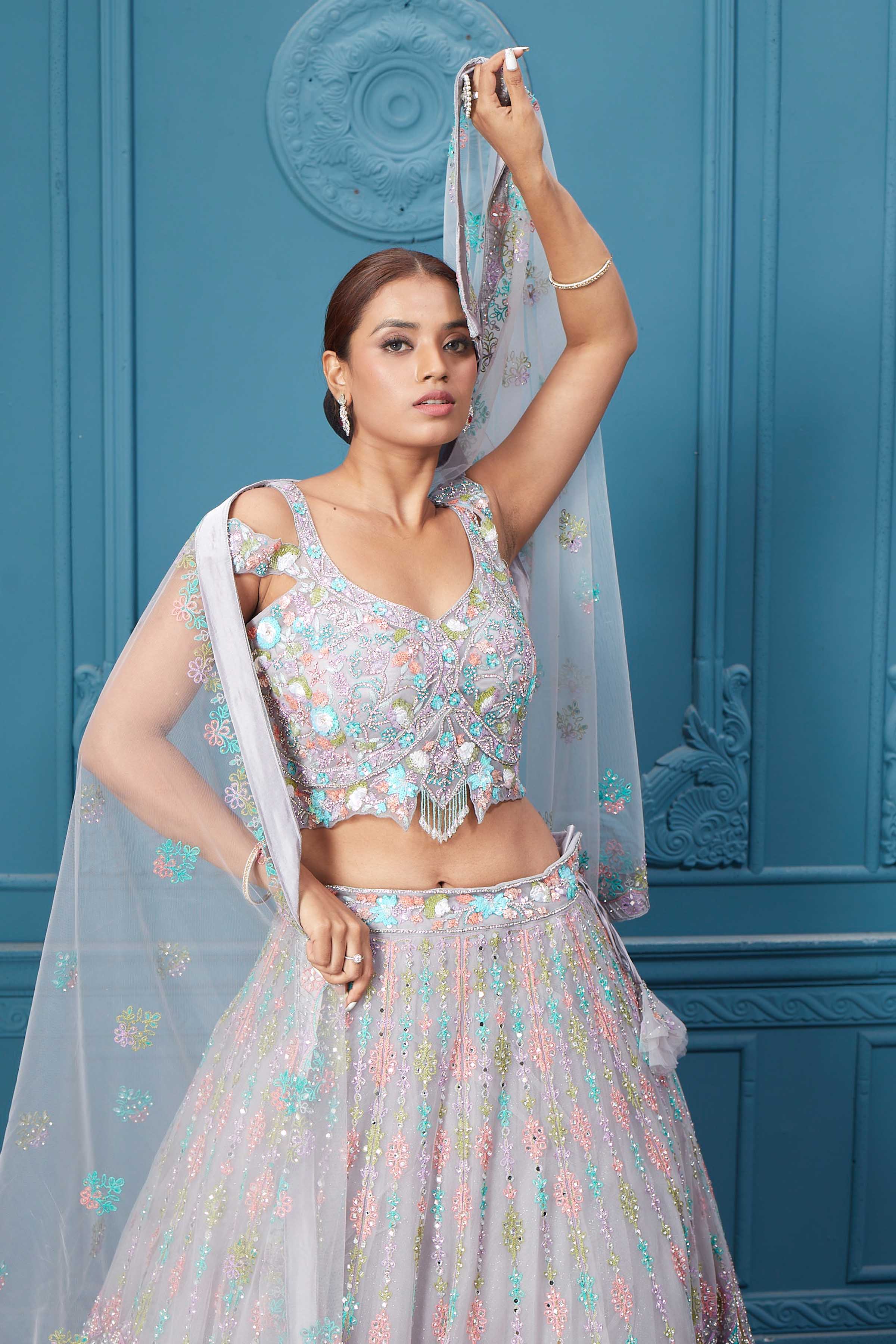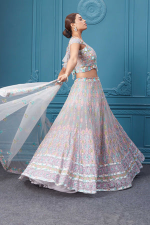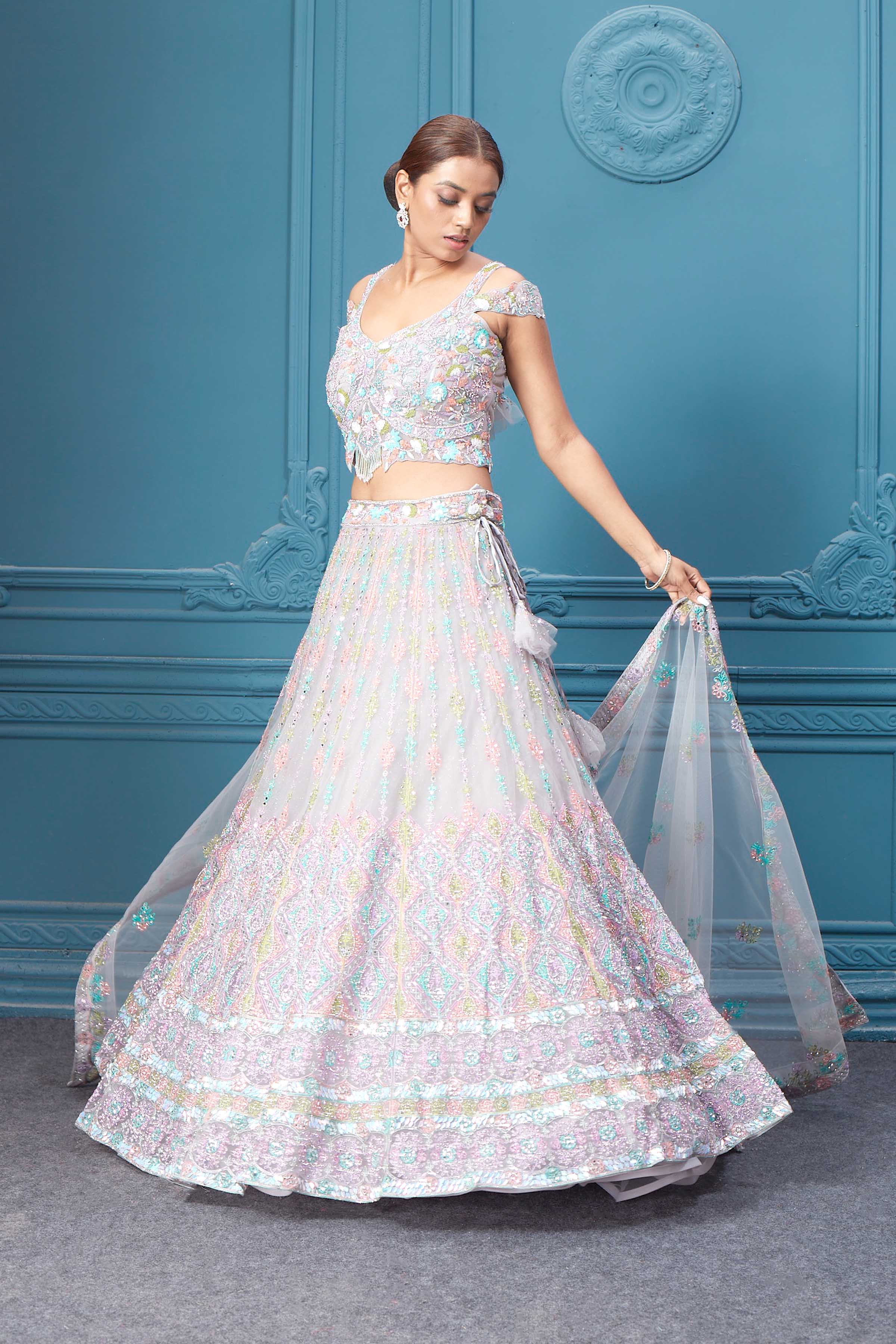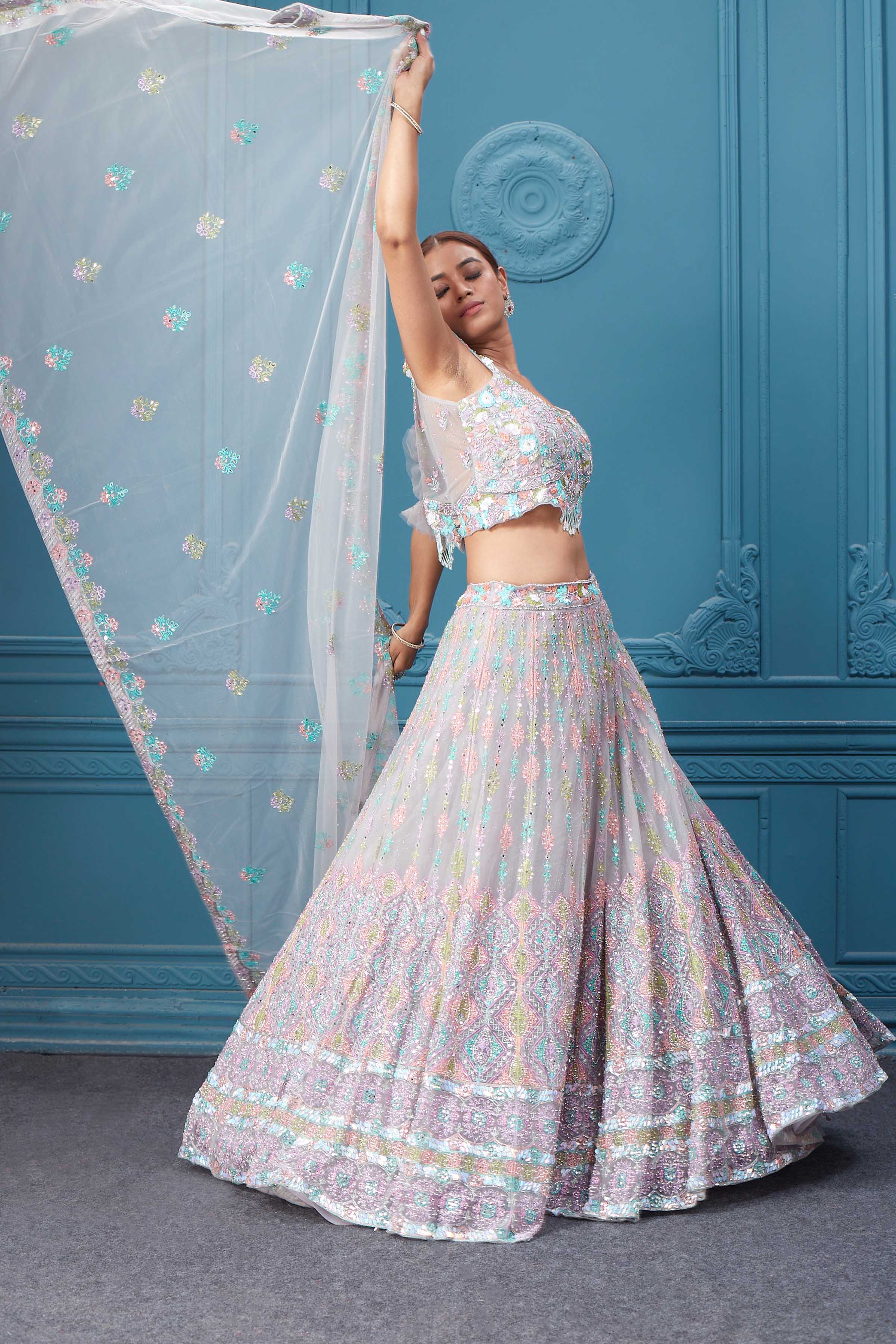 Look your best in this wedding season with this light pink lehenga with heavy multicolor sequin & mirror embroidery. The blouse is heavily embroidered, with attached pearls, and falling sleeves with tassels at the back. Dazzle on weddings and special occasions with exquisite Indian designer dresses, sharara suits, Anarkali suits, bridal lehengas, and sharara suits from Pure Elegance Indian clothing store in the USA. Shop online from Pure Elegance.