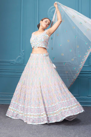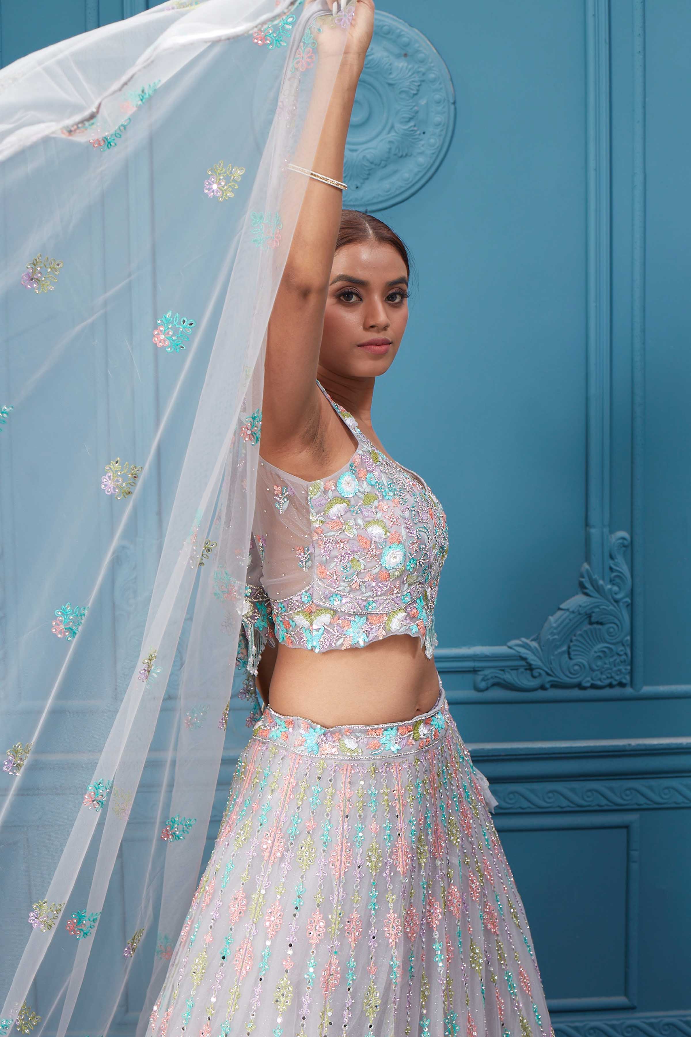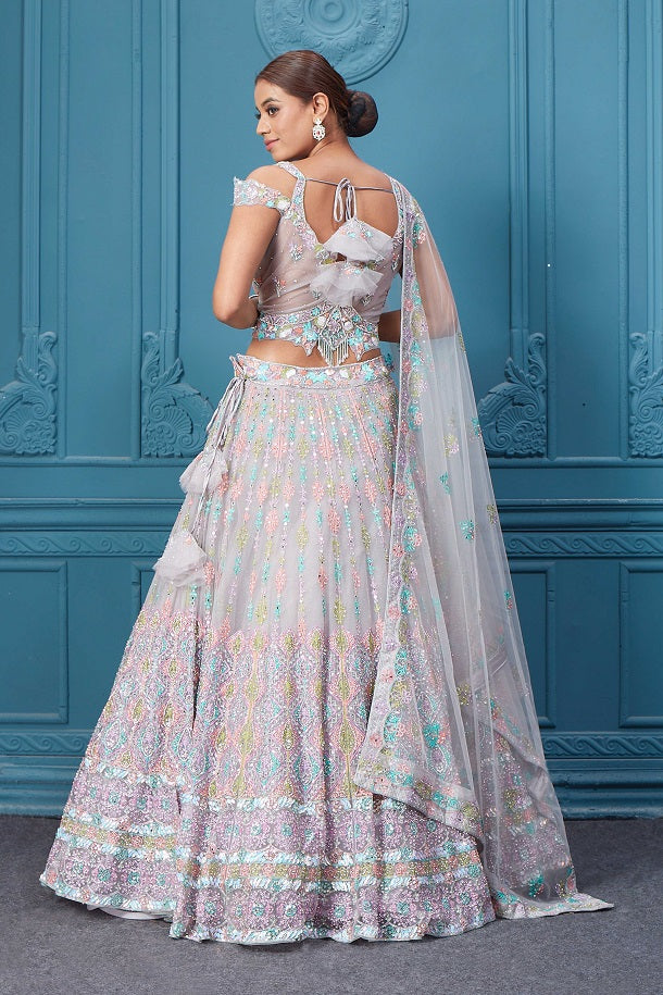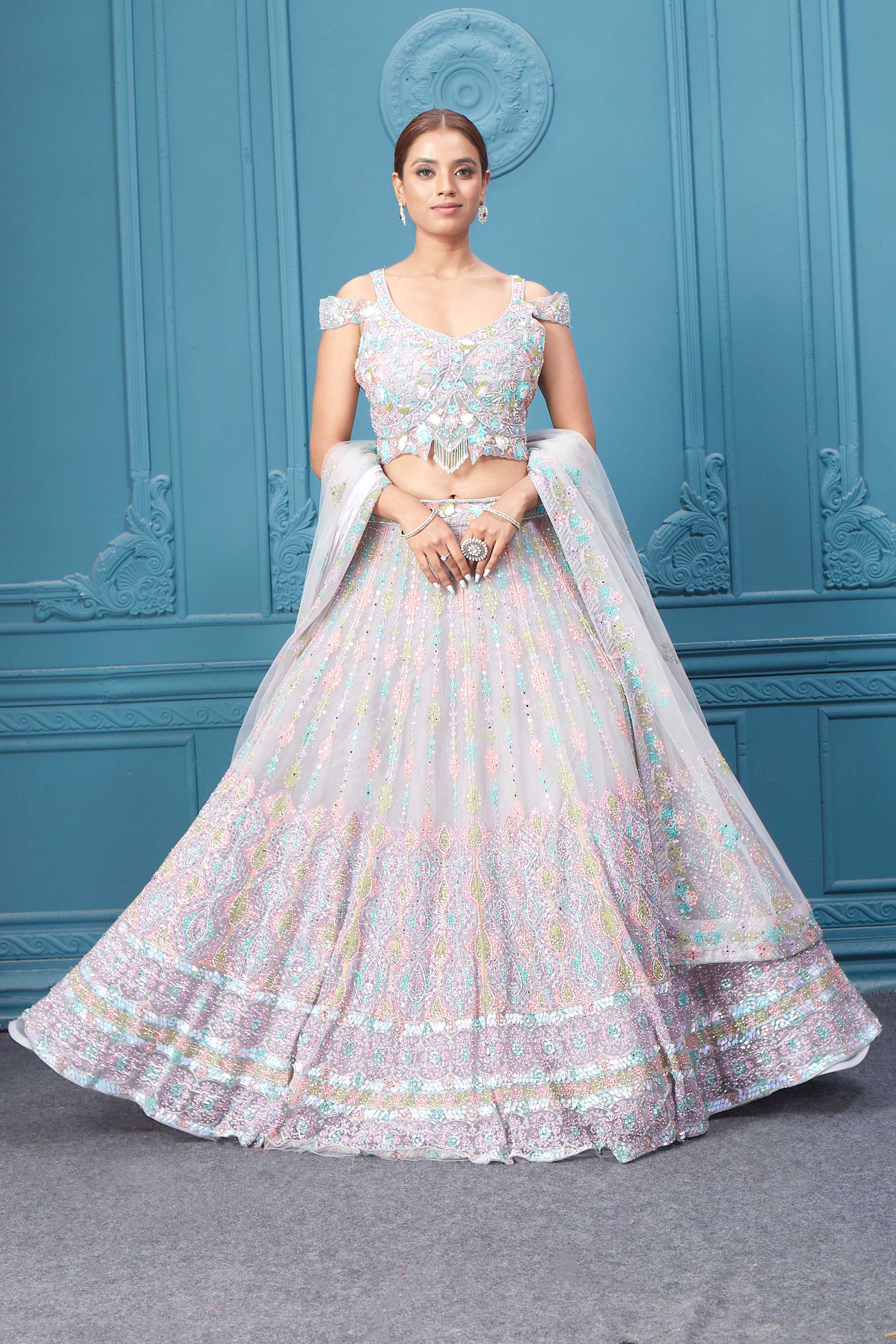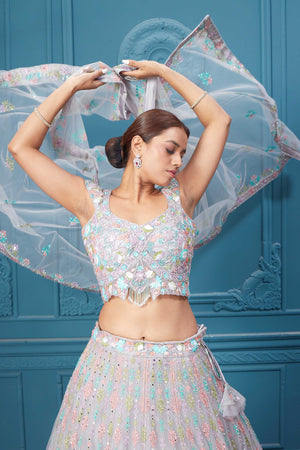 Look your best in this wedding season with this light pink lehenga with heavy multicolor sequin & mirror embroidery. The blouse is heavily embroidered, with attached pearls, and falling sleeves with tassels at the back. Dazzle on weddings and special occasions with exquisite Indian designer dresses, sharara suits, Anarkali suits, bridal lehengas, and sharara suits from Pure Elegance Indian clothing store in the USA. Shop online from Pure Elegance.