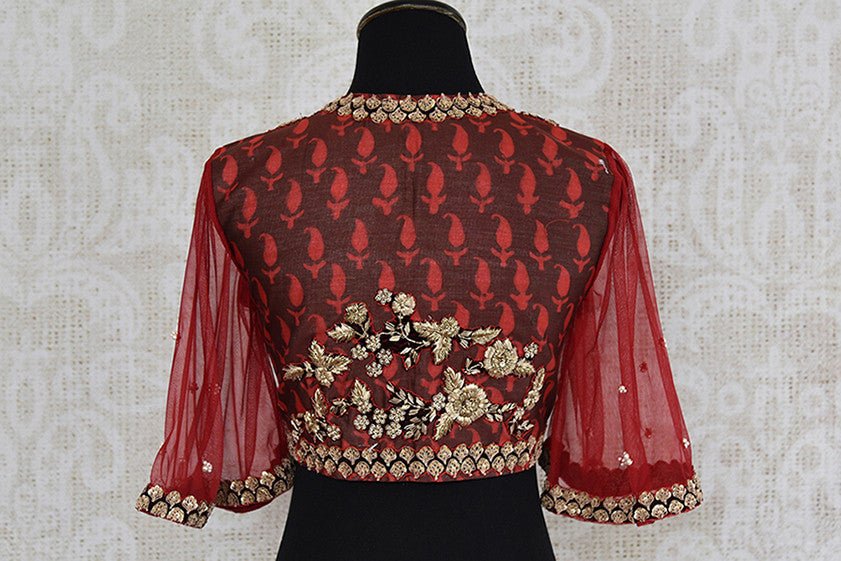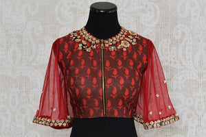 Red cotton silk blouse with net embroidered bell sleeves and front zipper. Perfect to pair with saree.