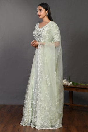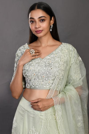 Beautiful mint green lehenga with organza dupatta. The lehenga is perfect for mehandi and sangeet parties. It is crafted in organza with intrinsic moti work. Shop online from Pure Elegance.