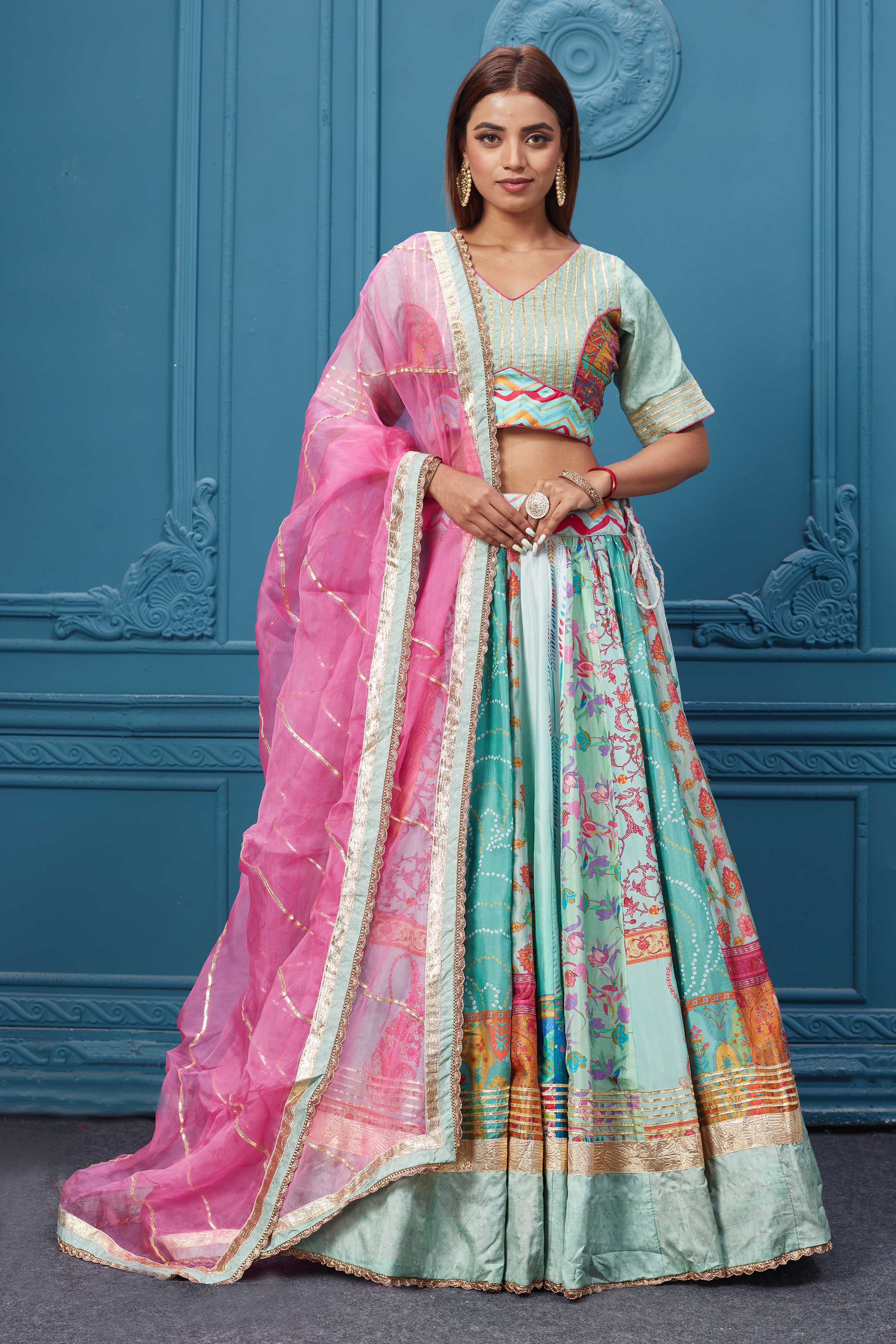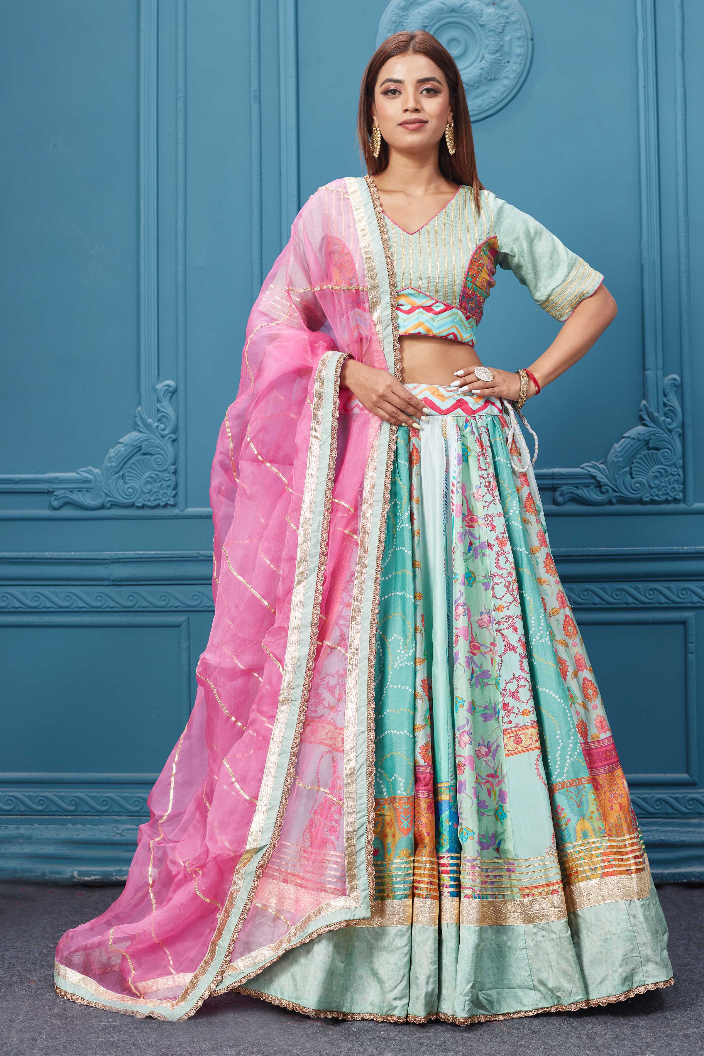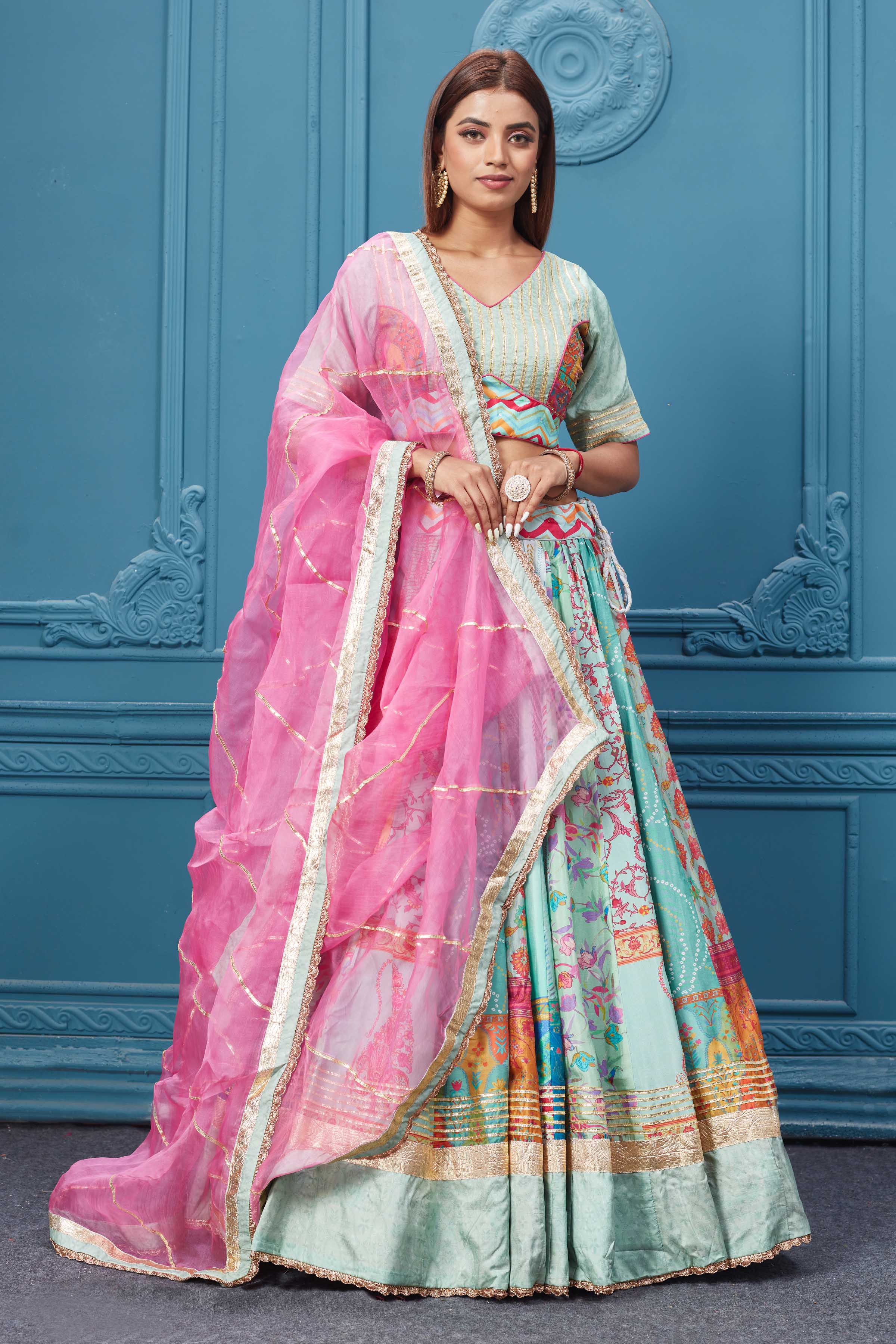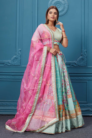 Red embroidered pastel blue lehenga with a contrasting pink gotta pati dupatta online in the USA. Featuring embroidered blouse with 3/4th sleeves blouse The Lehenga comes with a look royal at weddings and festive occasions in exquisite designer sarees, gowns, lehngas, Anarkali, and suits Pure Elegance Indian saree stores in the USA.