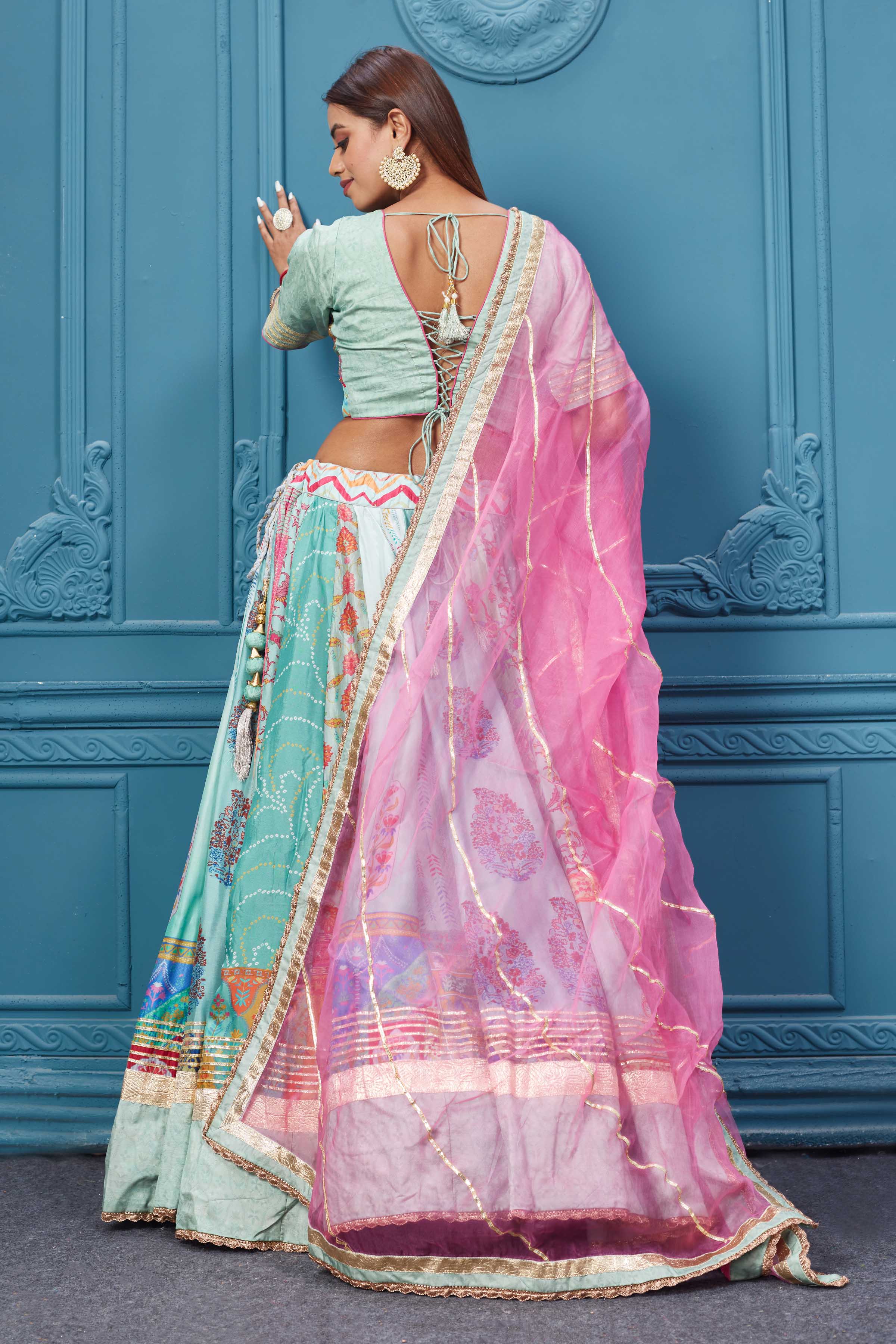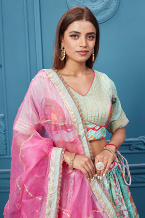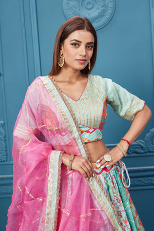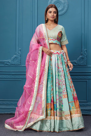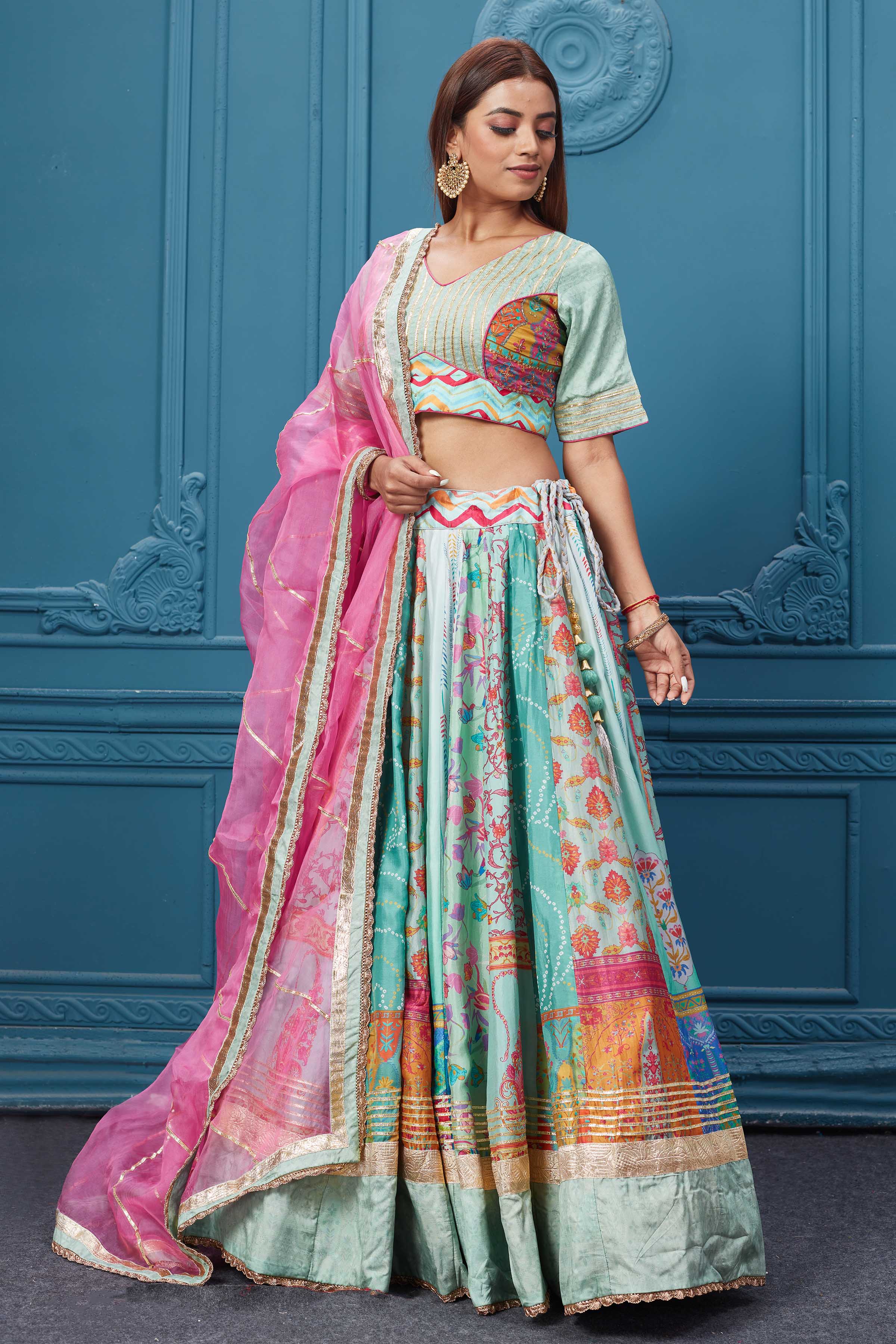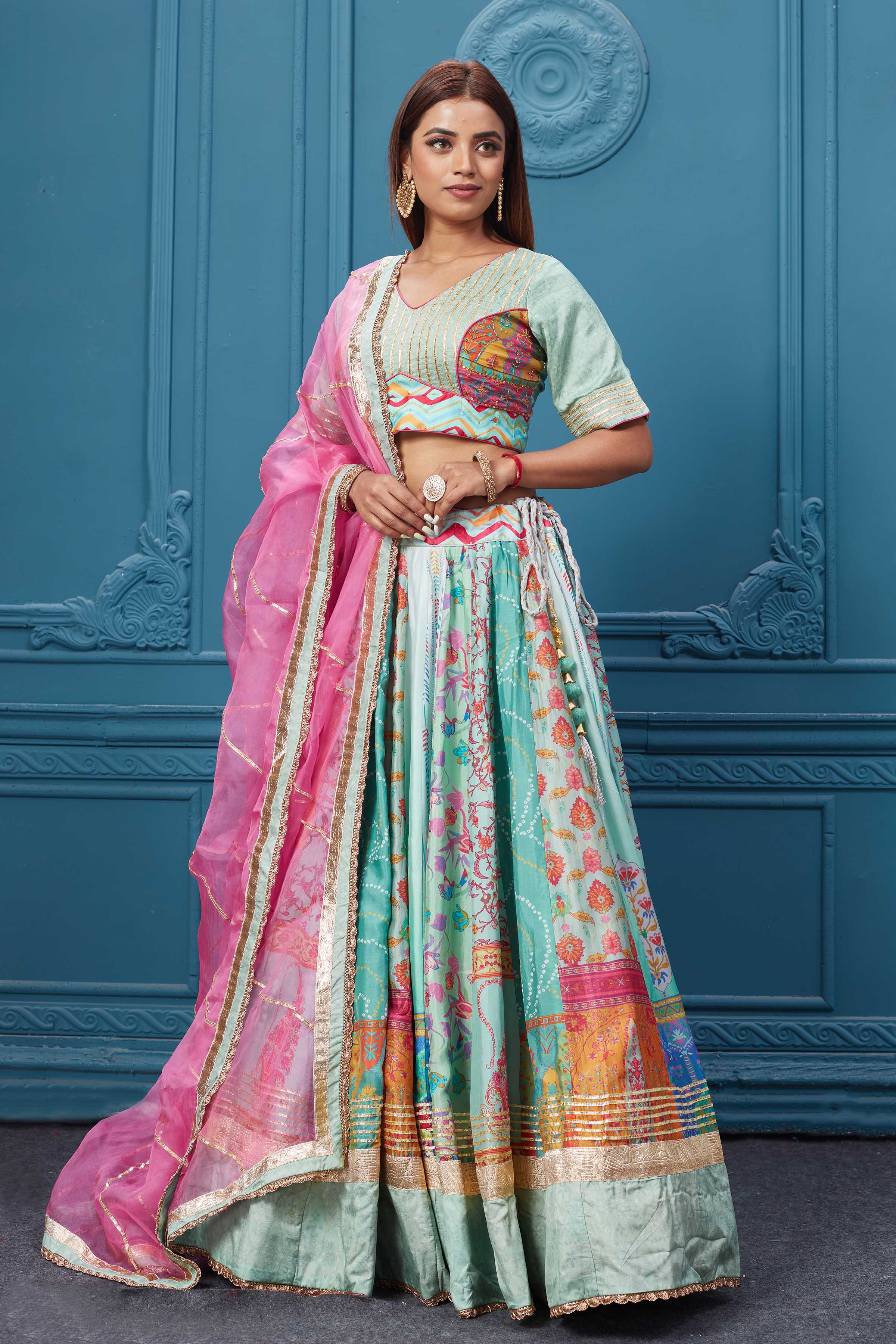 Red embroidered pastel blue lehenga with a contrasting pink gotta pati dupatta online in the USA. Featuring embroidered blouse with 3/4th sleeves blouse The Lehenga comes with a look royal at weddings and festive occasions in exquisite designer sarees, gowns, lehngas, Anarkali, and suits Pure Elegance Indian saree stores in the USA.