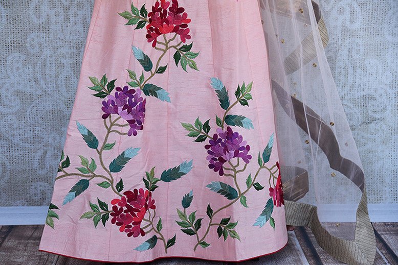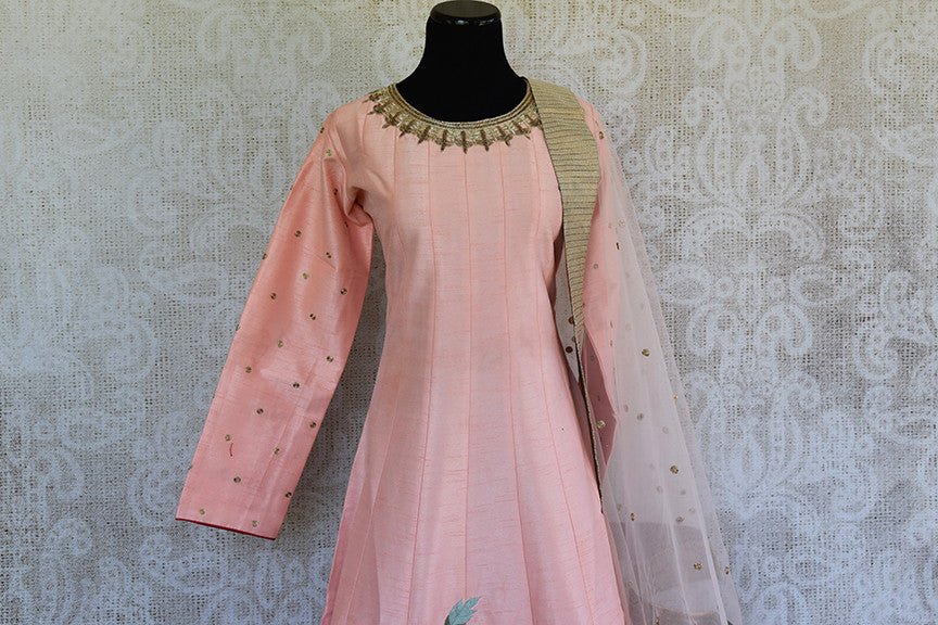 Pink floor length embroidered anarkali suit with net dupatta. Gorgeous suit for festivals and Indian events.