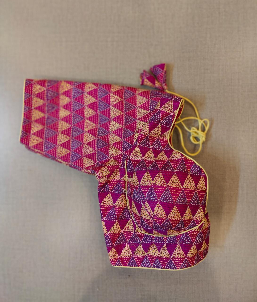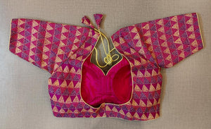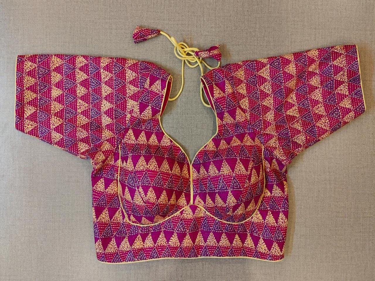Stun through evening soirees with this enigmatic pink blouse with a triangle pattern. Tailored in silk, it featured a U-neck. 3/4th sleeve, hook, and tie-up closure.Buy this designer blouse in the USA from Pure Elegance.