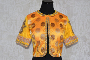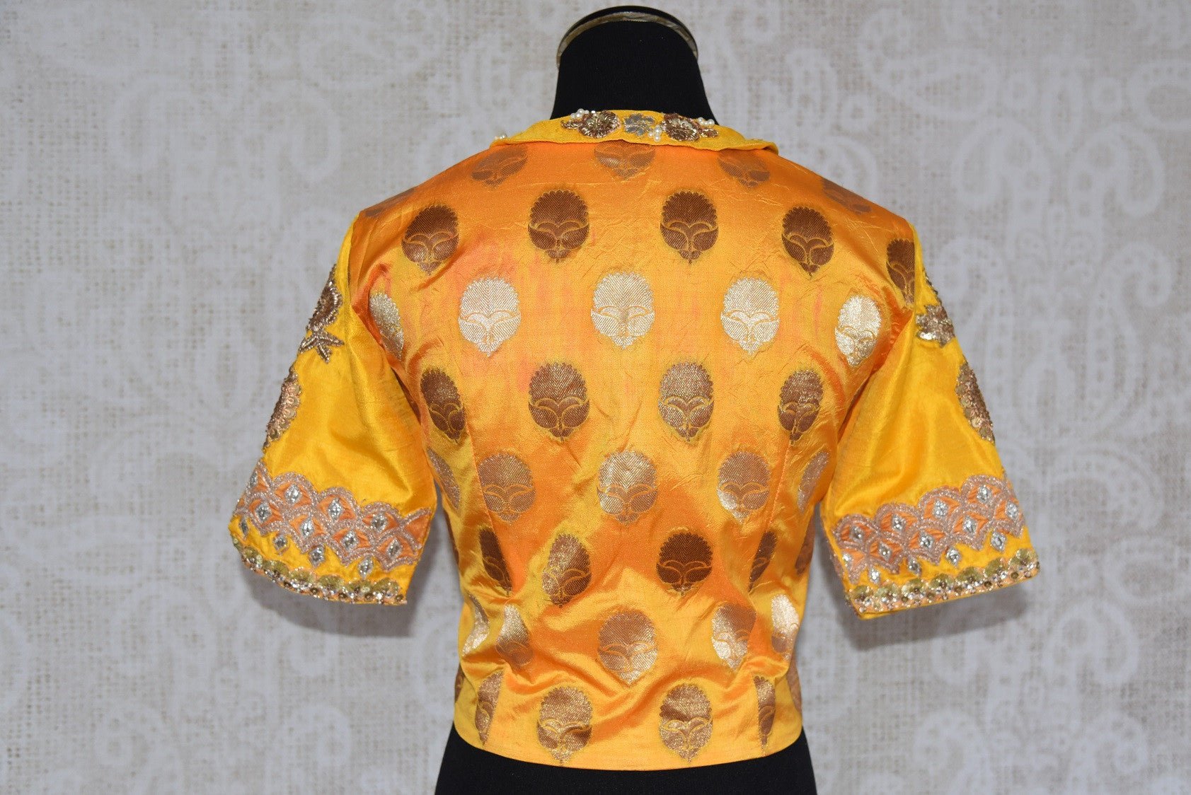 The ethnic yellow and golden embroidered banarasi silk blouse is a wardrobe must have with the high neck and half sleeves adding an adorable vibe. Sizes Available 34/36/38/40.