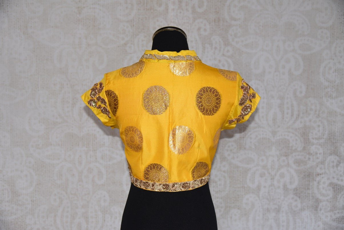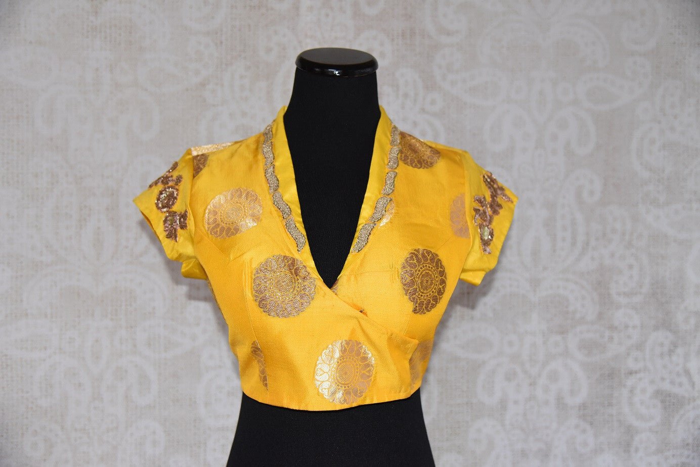 The perfect blend of ethnic and modern, this v neck crop top style yellow and golden embroidered banarasi silk blouse has a classy look. Sizes Available 34/36/38/40.