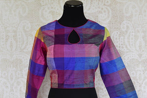 Purple checker ikkat silk blouse. This Blouse has front keyhole design and perfect to pair with solid saree.
