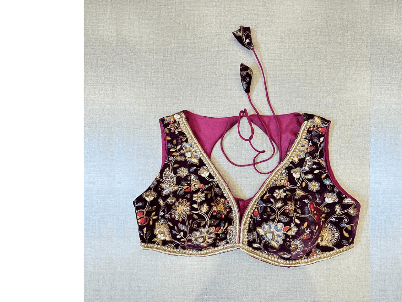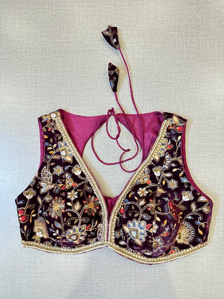 This blouse is a rich add-on to glam up your look. The sleeveless blouse features zari embroidery, a beautiful neck, and a hook closure at back. Team this blouse with a lovely solid saree to look gorgeous and create a stunning and beautiful look. Buy this designer blouse in the USA from Pure Elegance.