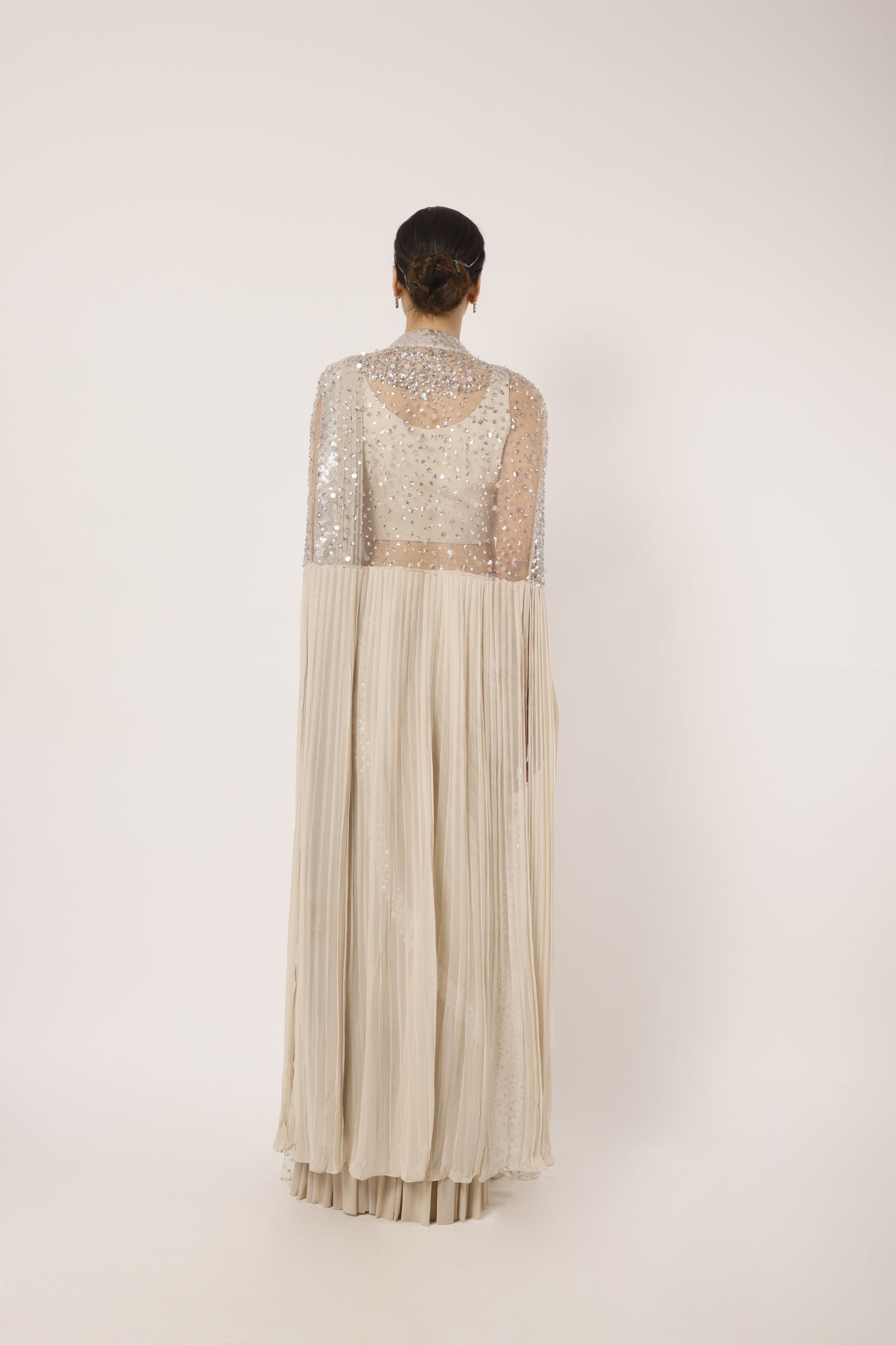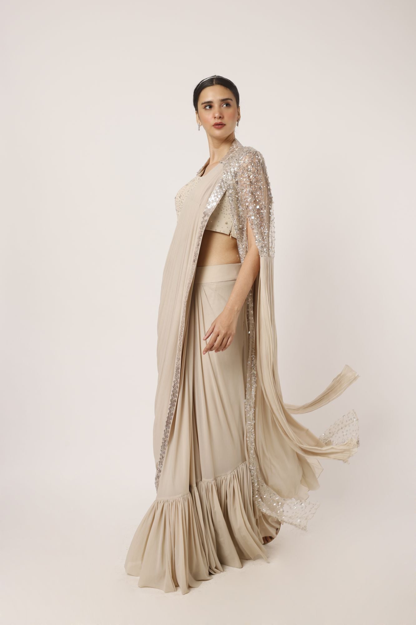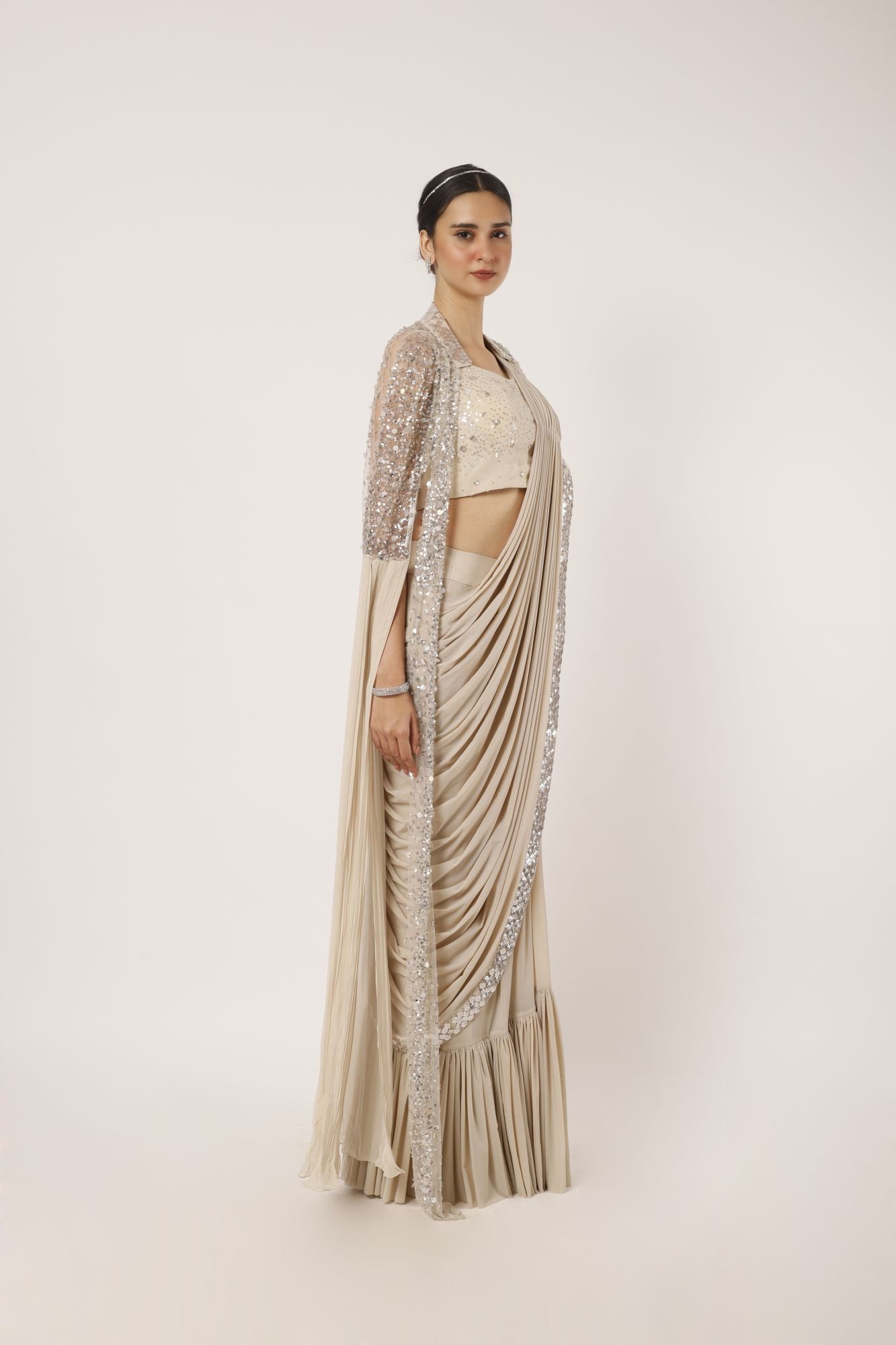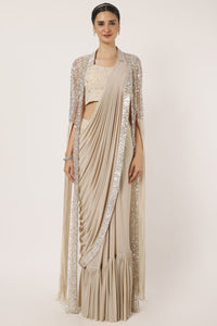 The georgette beige drape saree is embedded with gold work. It comes with a designer statement-sleeved cape and long tassels. Shop designer saris online in the USA from Pure Elegance.