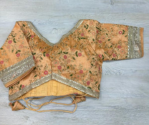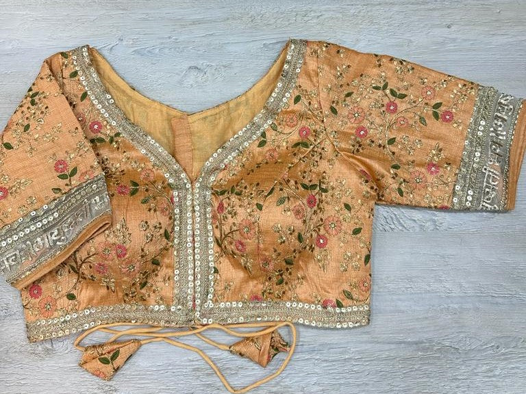 Beige embroidered blouse features floral zari embroidery, sequin embroidery on the edges, 3/4th sleeves with written " ayushmati bhav" on the edge, hook closure & tie-back at the back. Team this blouse with a contrasting saree to look gorgeous and create a stunning and beautiful look. Buy this designer blouse in the USA from Pure Elegance.
