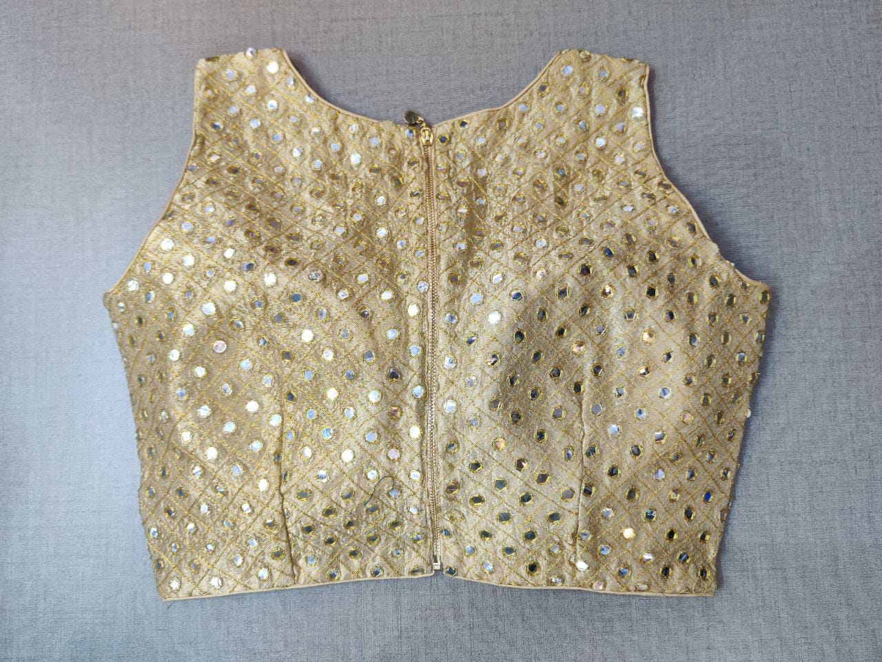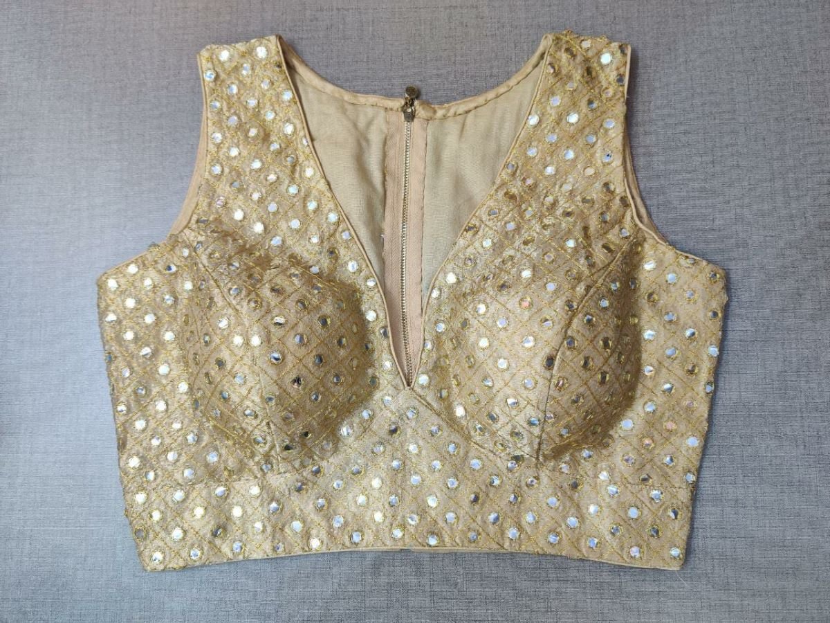 Give your ethnic look a dazzling update with this beige blouse. Tailored in silk, it features sleeveless, mirror embroidery, a V-neck in the front, and zip closure at the back details. Pair it with a complementary solid sari and diamond stud earrings. Buy this designer blouse in the USA from Pure Elegance.