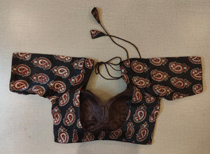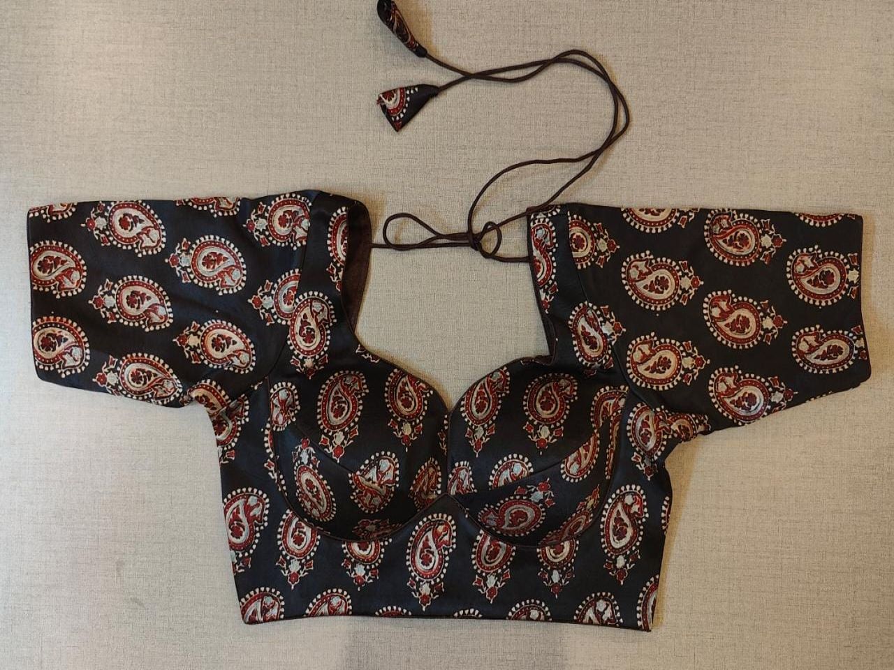 Women's black Ajrakh Block Printed, padded Saree Blouse, has round neck, Hook & tie-up closure at back with 3/4th sleeves. Classic is never old and enough to have in your closet!! Pair this fashionable blouse with a beautifully printed sari and statement neckpiece and you are good to go! Buy this designer blouse in the USA from Pure Elegance.