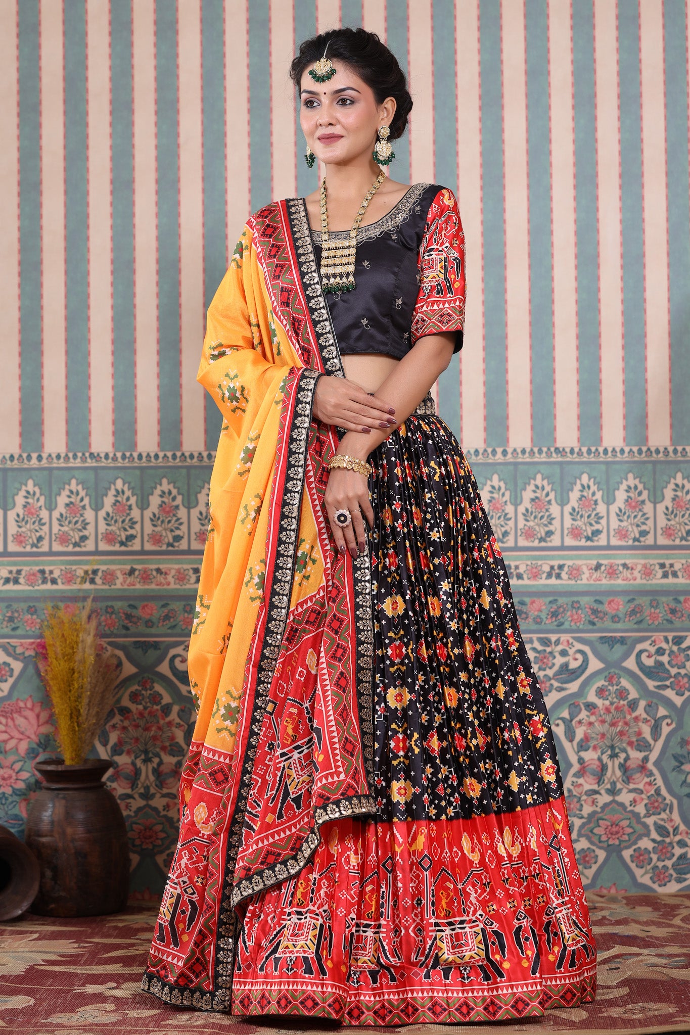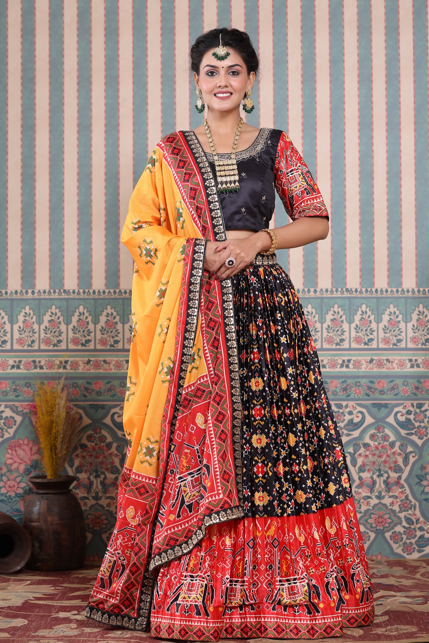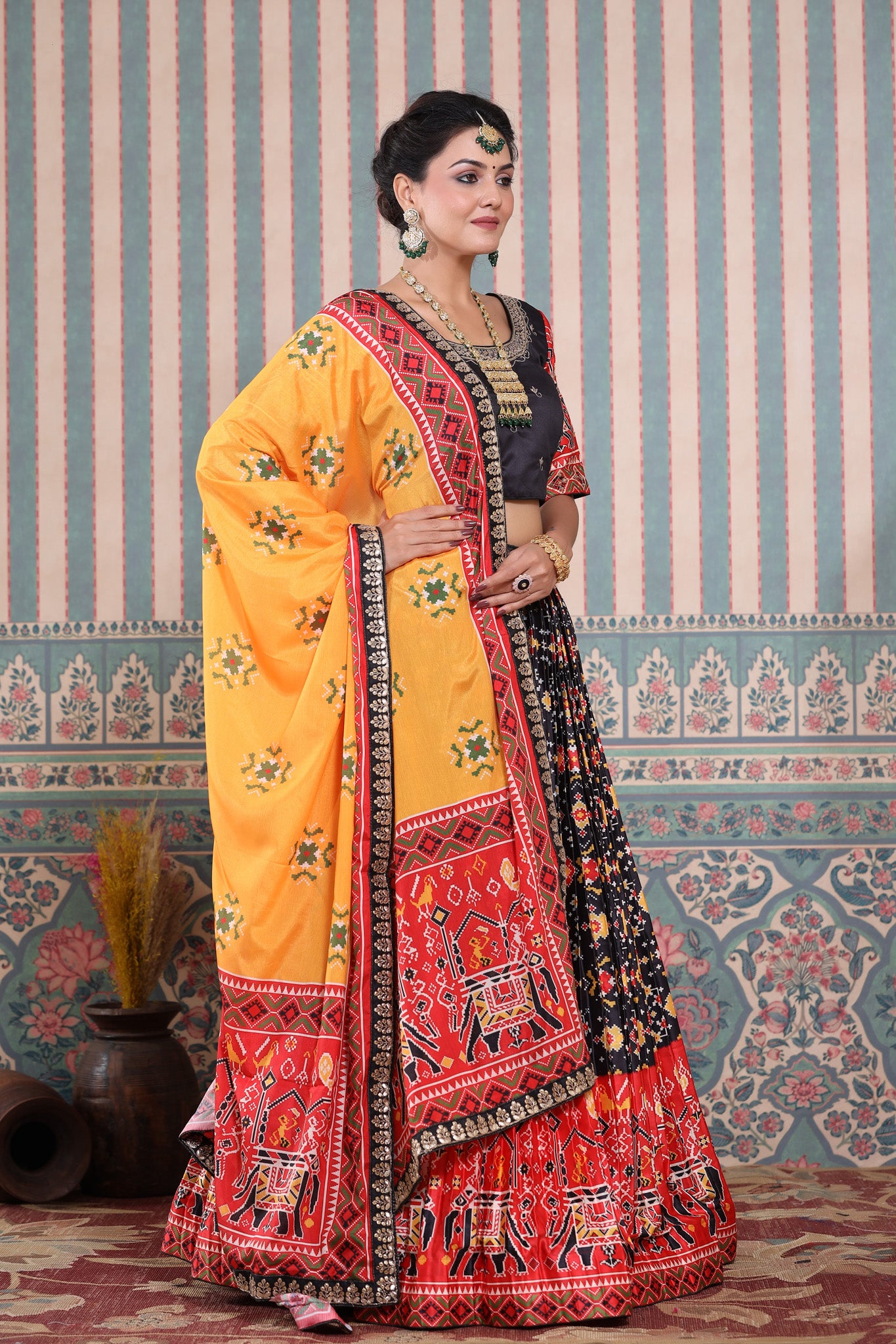Black multicolor lehenga set featuring bhandhej printed silk lehenga set. It comes with a beautiful yellow blouse, gotta pati work red dupatta. Pair it with beautiful jewelry to enhance your look. Shop online from Pure Elegance.