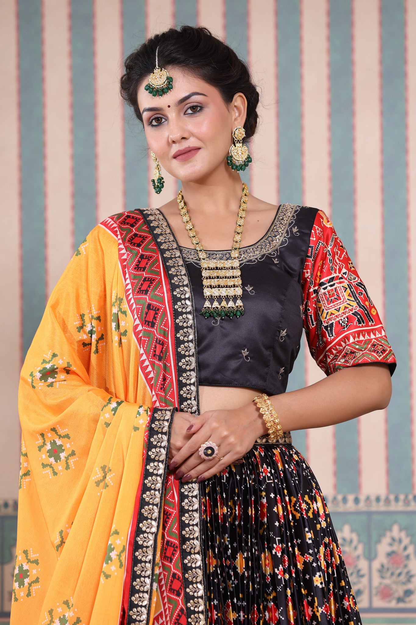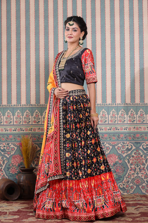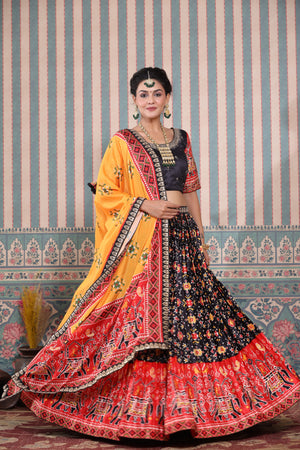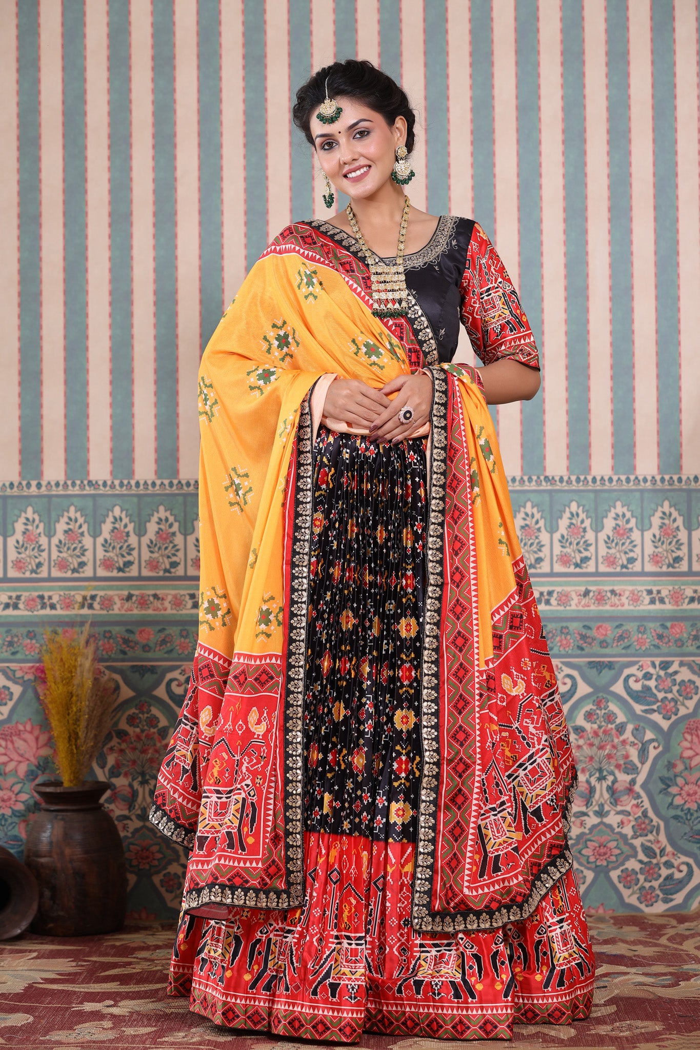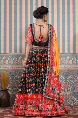 Black multicolor lehenga set featuring bhandhej printed silk lehenga set. It comes with a beautiful yellow blouse, gotta pati work red dupatta. Pair it with beautiful jewelry to enhance your look. Shop online from Pure Elegance.