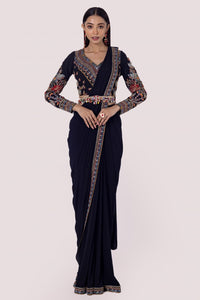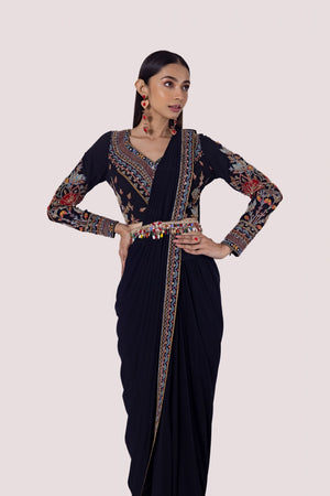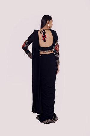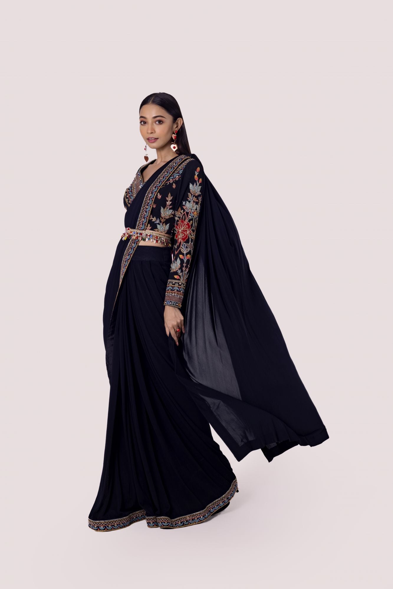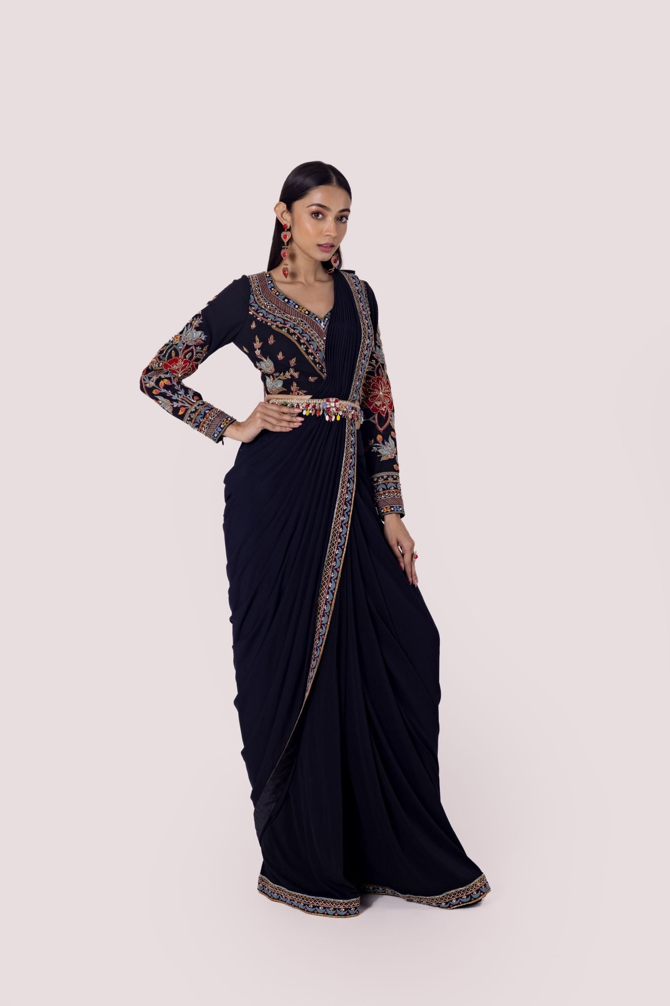 Black net drape saree set featuring multicolor thread, pearls, cut dana and cheed work on the blouse and border. Paired with a traditional pearl work belt. Shop designer saris online in the USA from Pure Elegance.