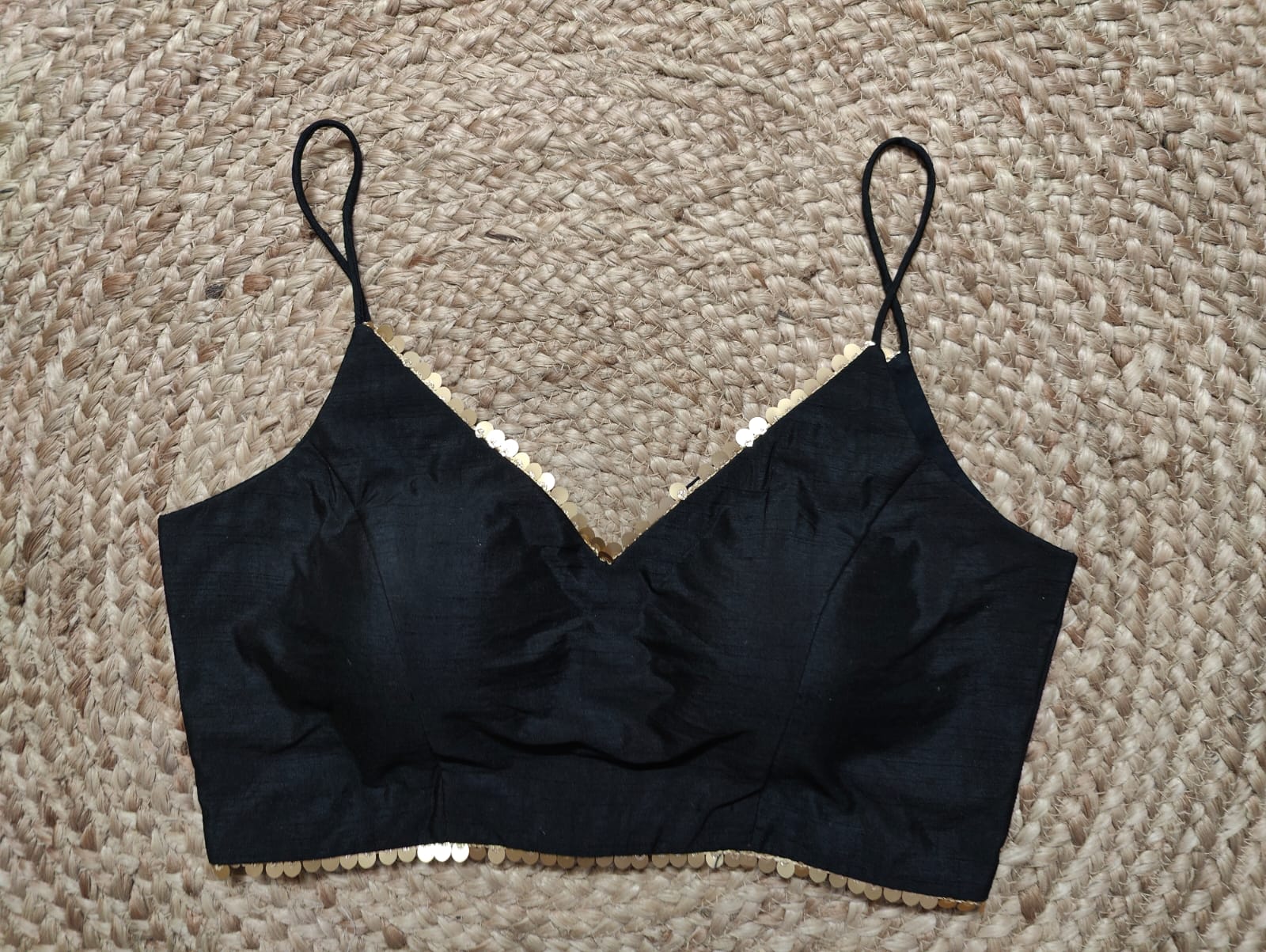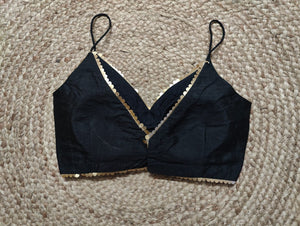 Add a dash of shine to starlight nights with this elegant black strappy blouse. Pair it with an Indian designer silk saree to grace up your look. Buy this designer blouse in USA from Pure Elegance.