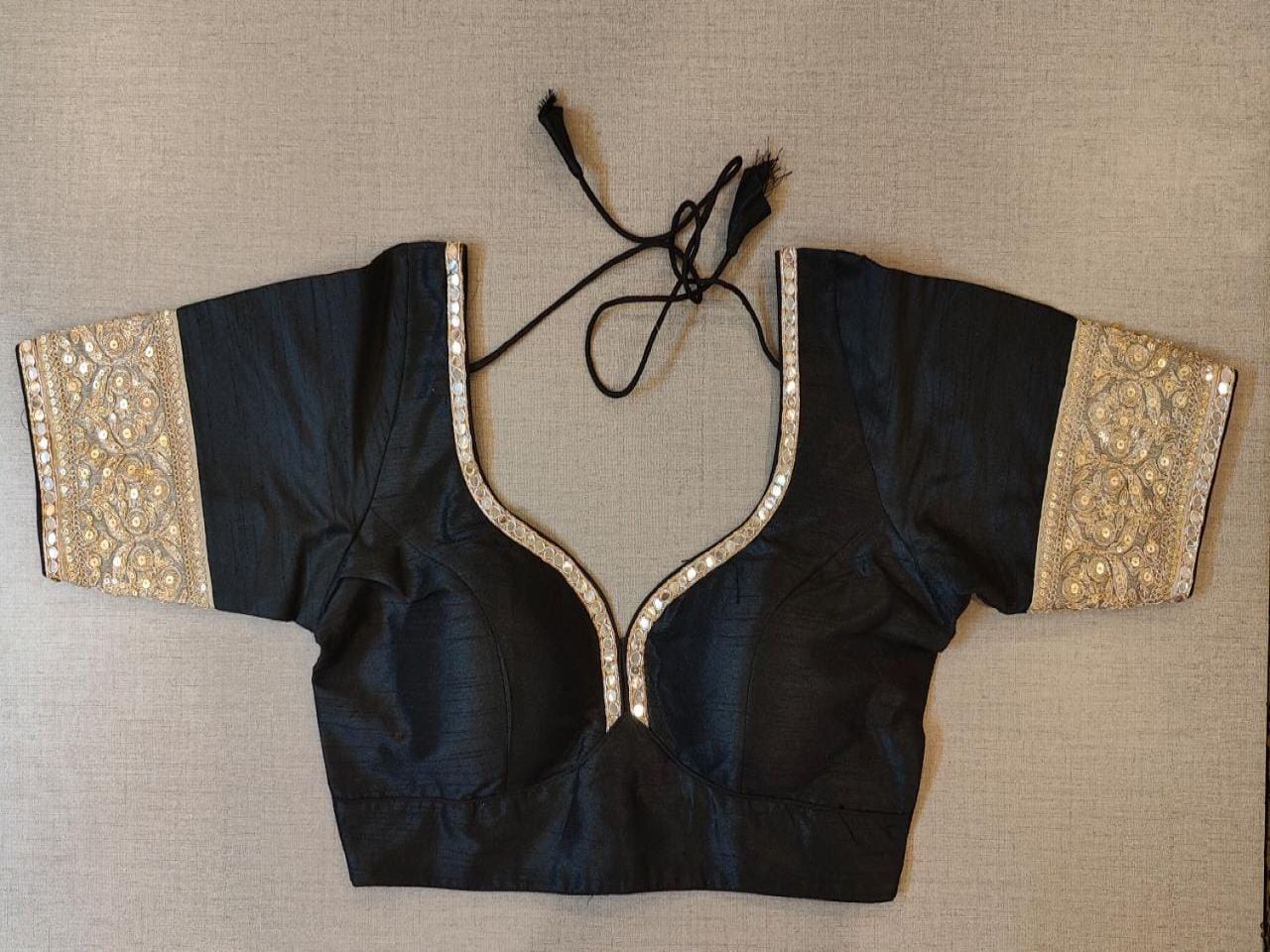 Classic is never old and enough to have in your closet!! This blouse compliments a beautiful sequin embroidery, 3/4th sleeves, V neck, hooks closure & tie-up at the back. Pair this fashionable black blouse with beautiful statement earrings and you are good to go! Buy this designer blouse in the USA from Pure Elegance.