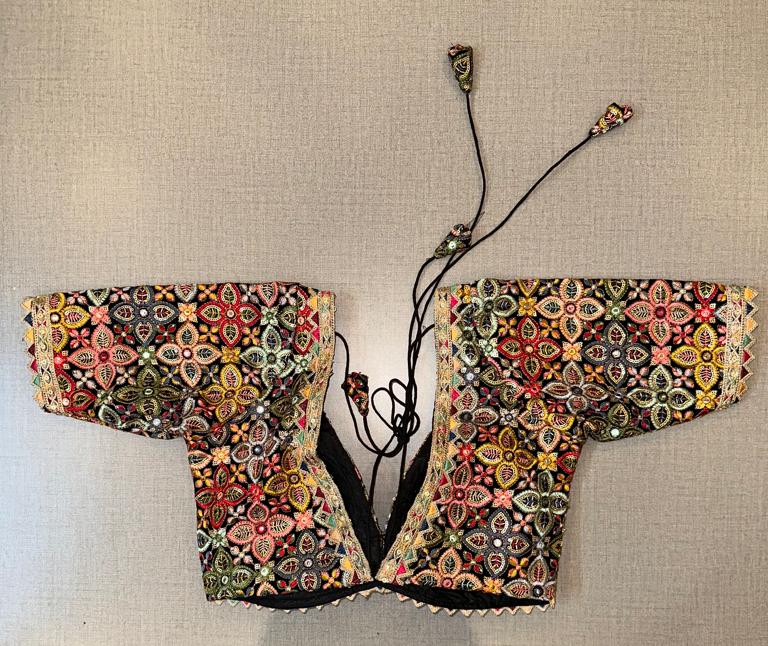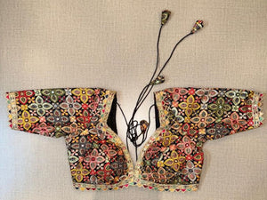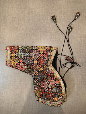 Classic is never old and enough to have in your closet!! This blouse compliments a beautiful multicolor floral embroidery, mirror work, 3/4th sleeves, V neck, hooks closure & tie-up at the back. Pair this fashionable black blouse with beautiful statement earrings and you are good to go! Buy this designer blouse in the USA from Pure Elegance.