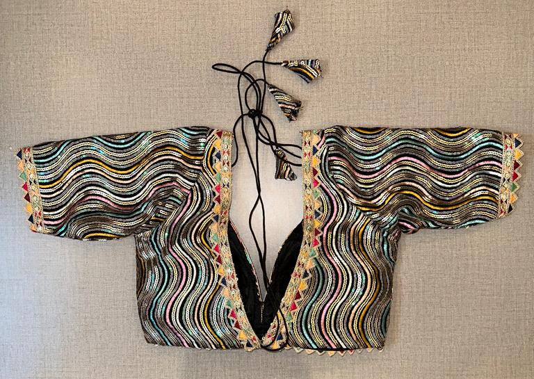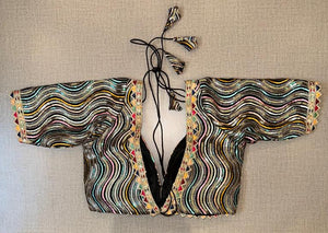 Classic is never old and enough to have in your closet!! This blouse compliments a beautiful multicolor sequin wave embroidery, and gotta Patti on borders, 3/4th sleeves, V neck, hooks closure & tie-up at the back. Pair this fashionable black blouse with beautiful statement earrings and you are good to go! Buy this designer blouse in the USA from Pure Elegance.
