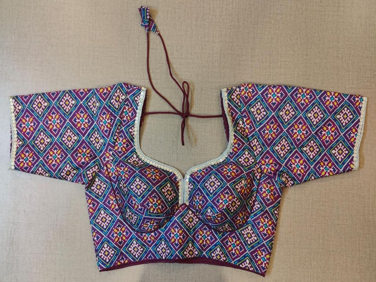 Women's blue and purple Ajrakh Block Printed, padded Saree Blouse, has round neck, Hook & tie-up closure at back with 3/4th sleeves. Classic is never old and enough to have in your closet!! Pair this fashionable blouse with a beautifully printed sari and statement neckpiece and you are good to go! Buy this designer blouse in the USA from Pure Elegance.