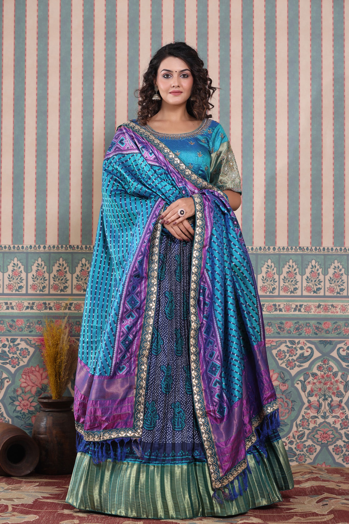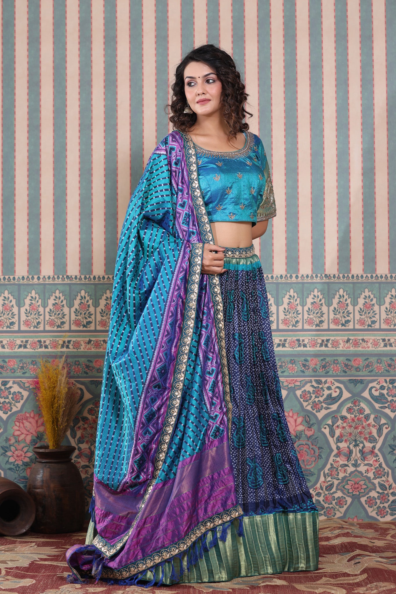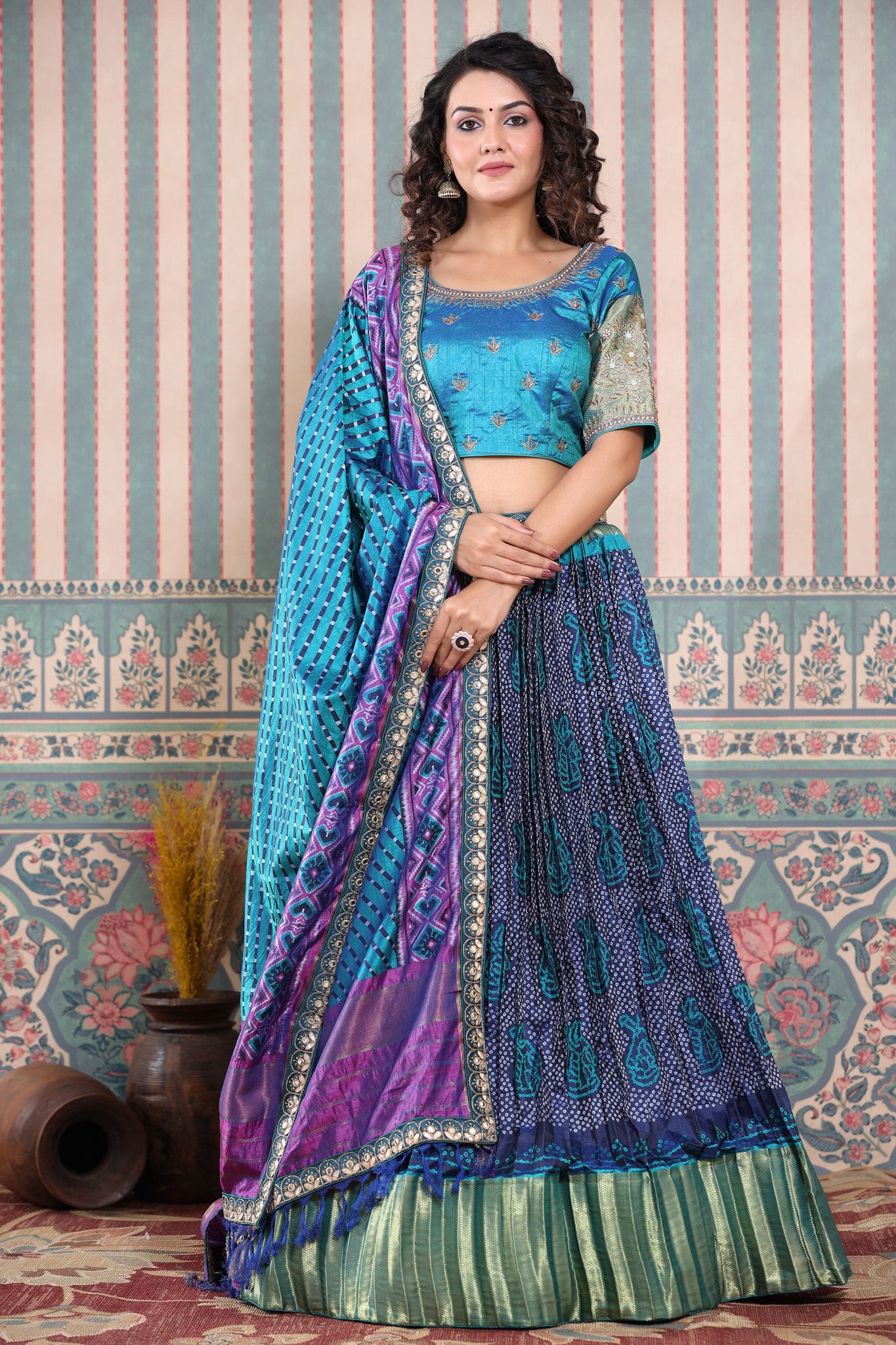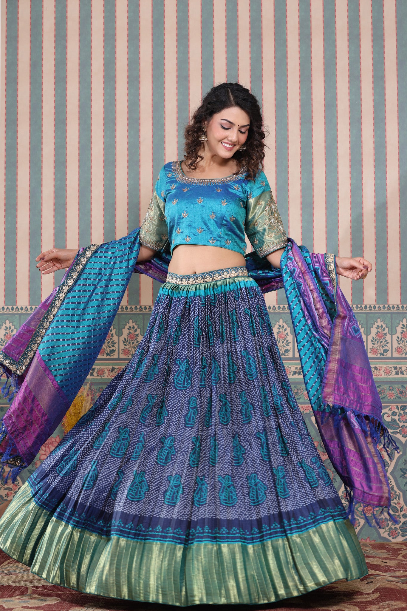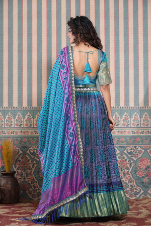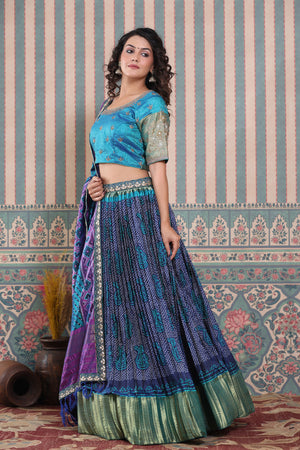 Blue bandhej printed lehenga set featuring blue and purple printed dupatta with gota patti embroidered and blue embroidered blouse. Pair it with beautiful jewelry to enhance your look. Shop online from Pure Elegance.