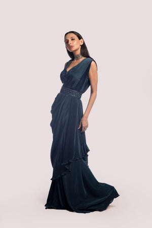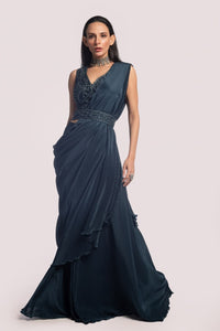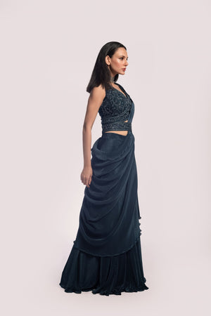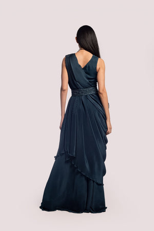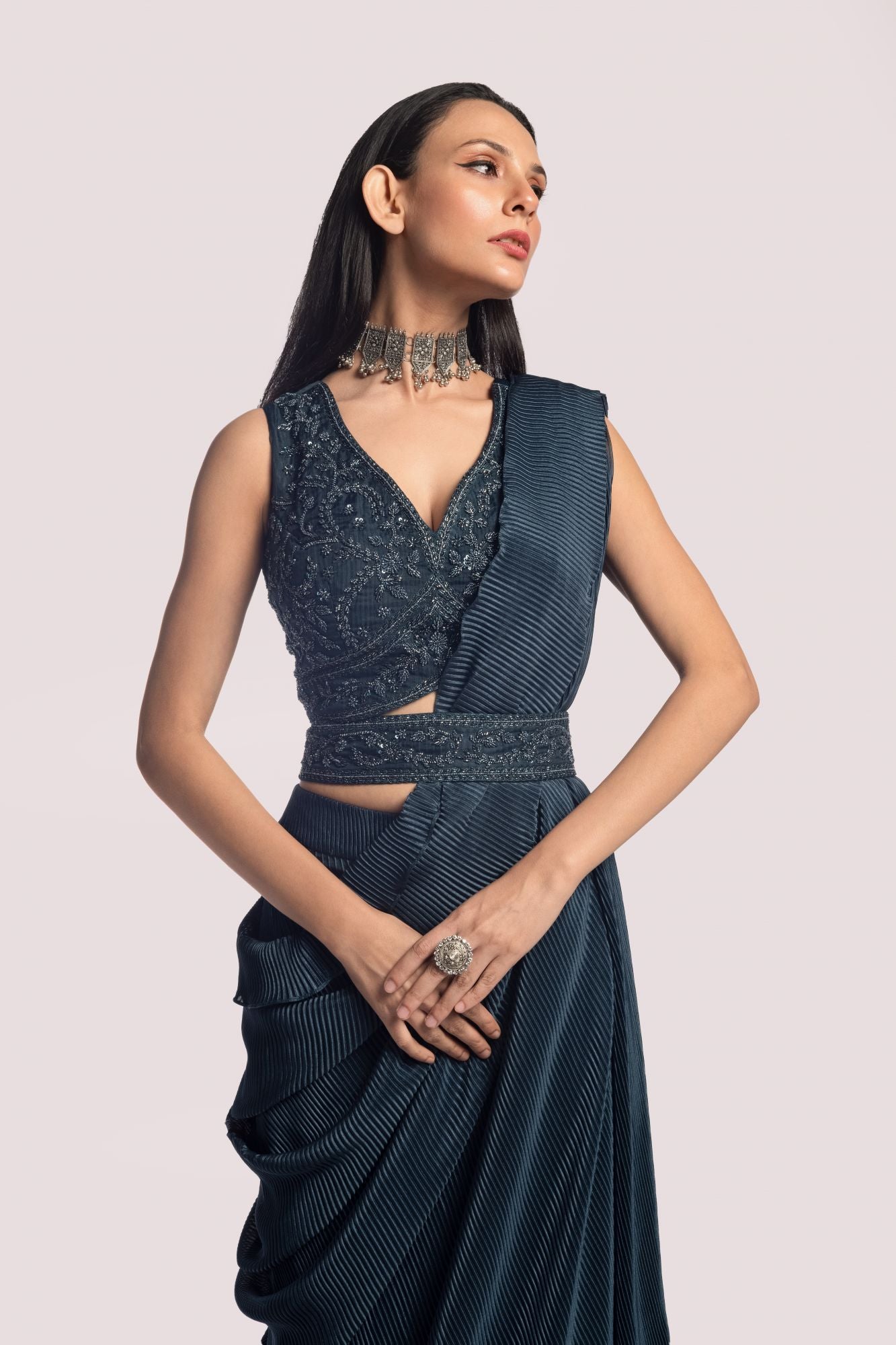 Navy blue drape saree set embedded with mirror and cut dana work. It comes with an embroidered blouse & belt. Shop designer saris online in the USA from Pure Elegance.