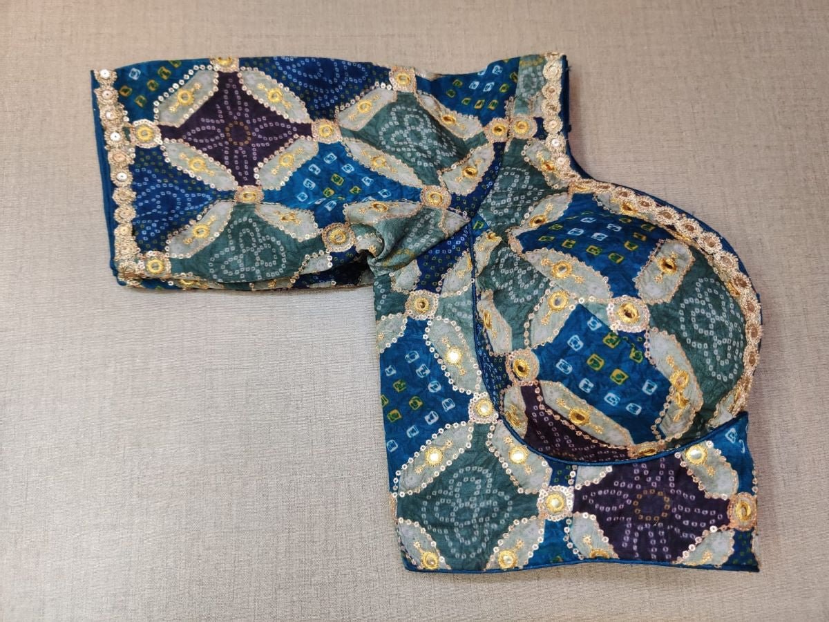 Exquisite blue color mirror work with bhandej design. It has a V back and tassels to tie up. Pairs it with a contrasting saree to make your look more graceful. Perfect blouse for Indian festivals. Buy this designer blouse in the USA from Pure Elegance.