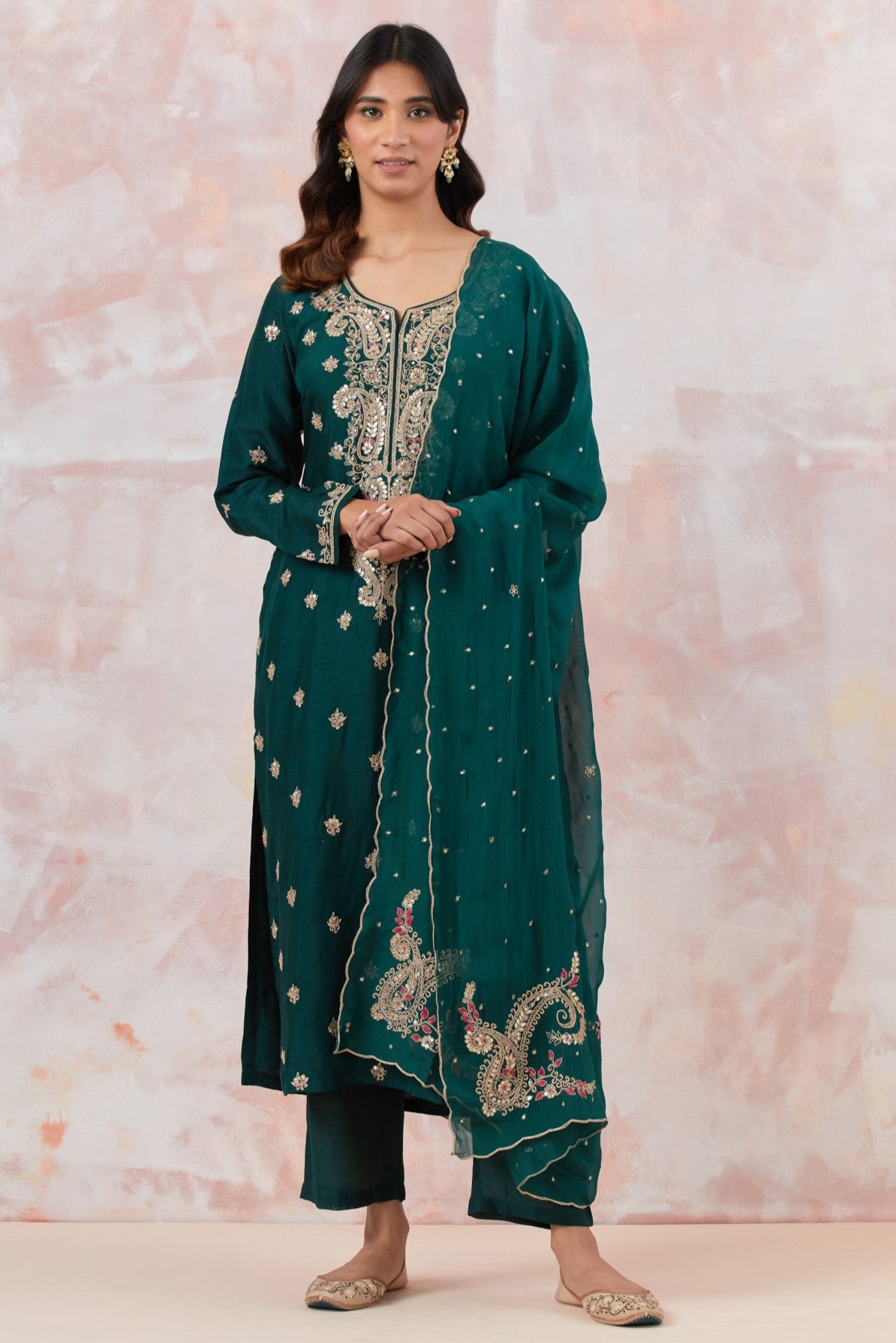 Bottle green suit set featuring Kurta with gotta pati and aari work, paired with bottom and organza dupatta. Shop online from Pure Elegance.