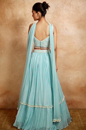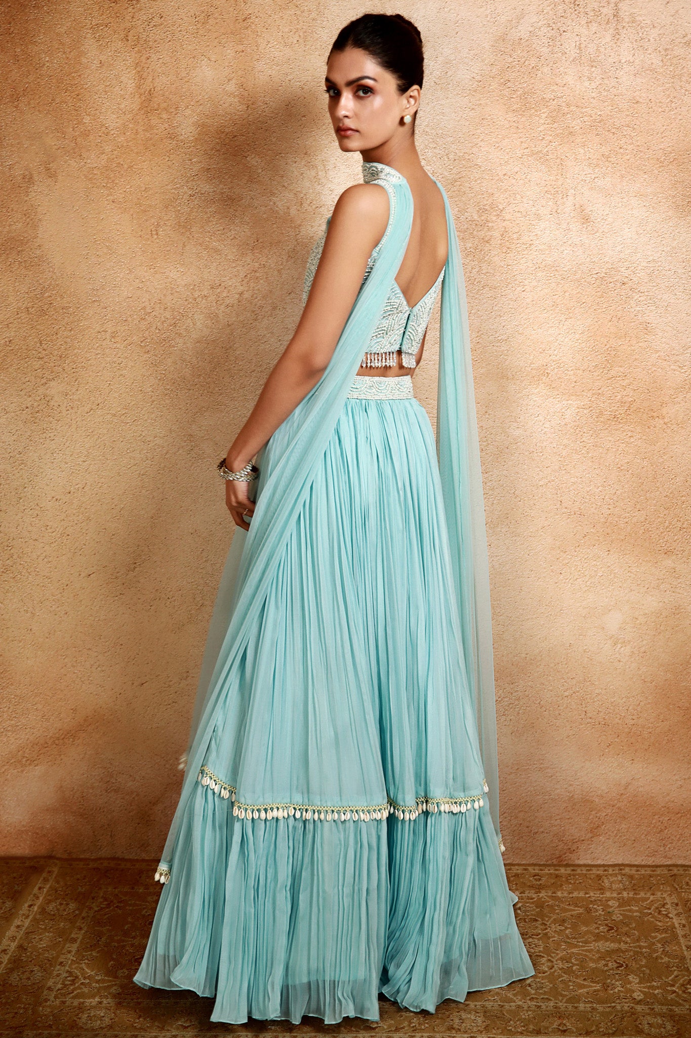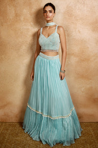 Look your best on wedding occasions with this blue lehenga with a pearl embroidered blouse, sleeveless, and with a sweetheart neckline. The lehenga comes with a soft net dupatta. Shop online from Pure Elegance.