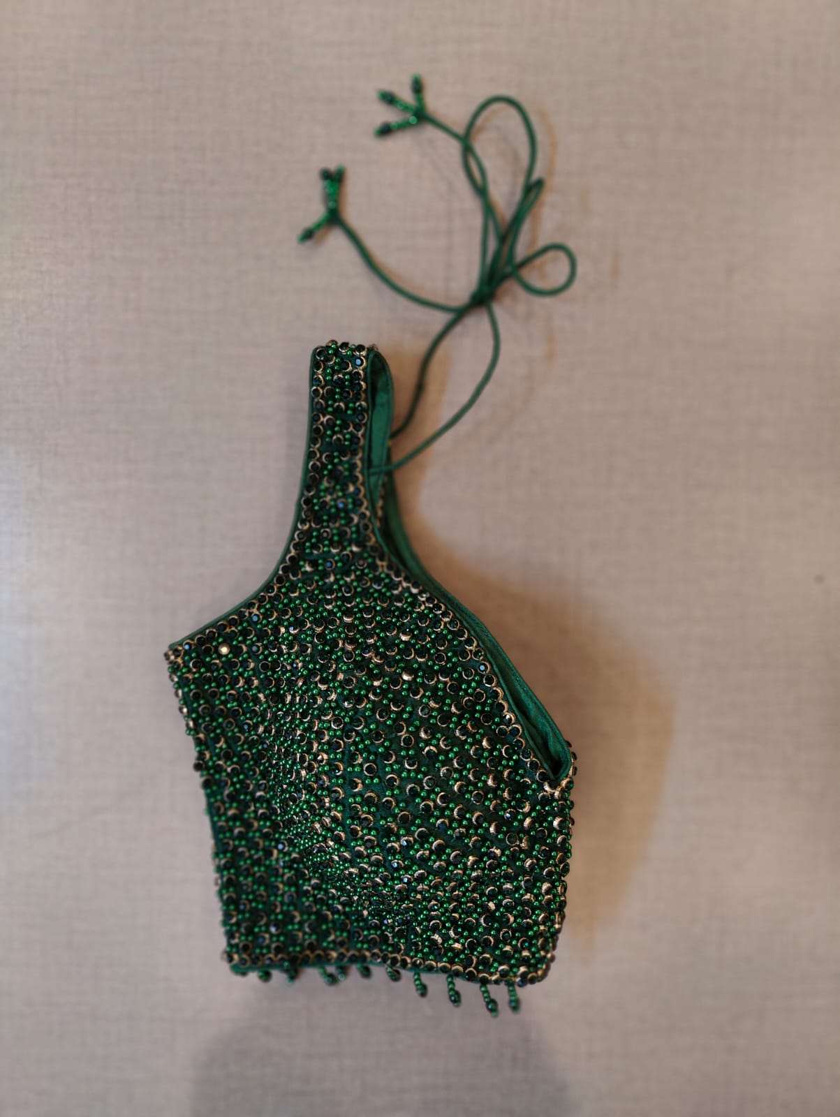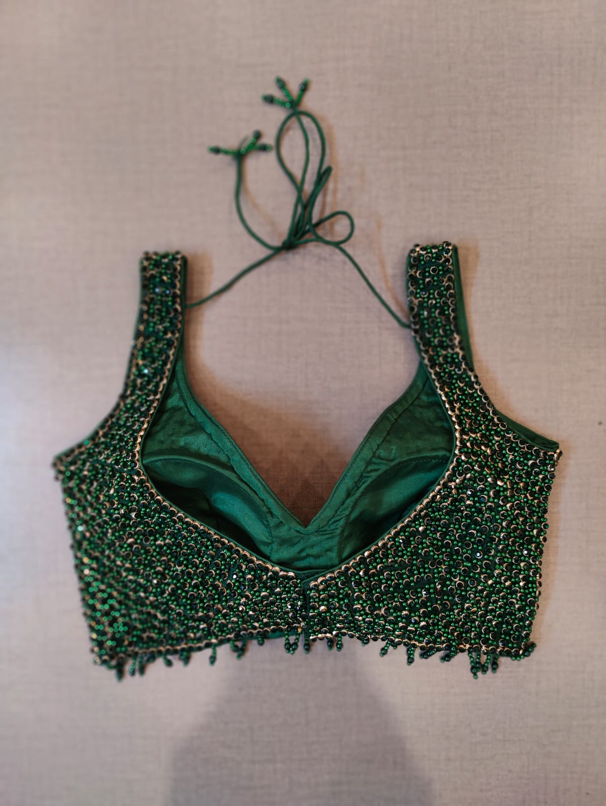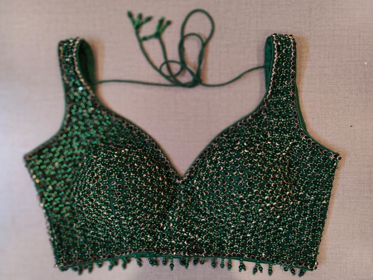 Tailored in a timeless hue and topped with elegant pearl & sequin details, this green blouse is an evergreen addition to your festive wardrobe and party look. It is designed with a V neckline, sleeveless, and back hook closure with a tie-up. Buy this designer blouse in the USA from Pure Elegance.