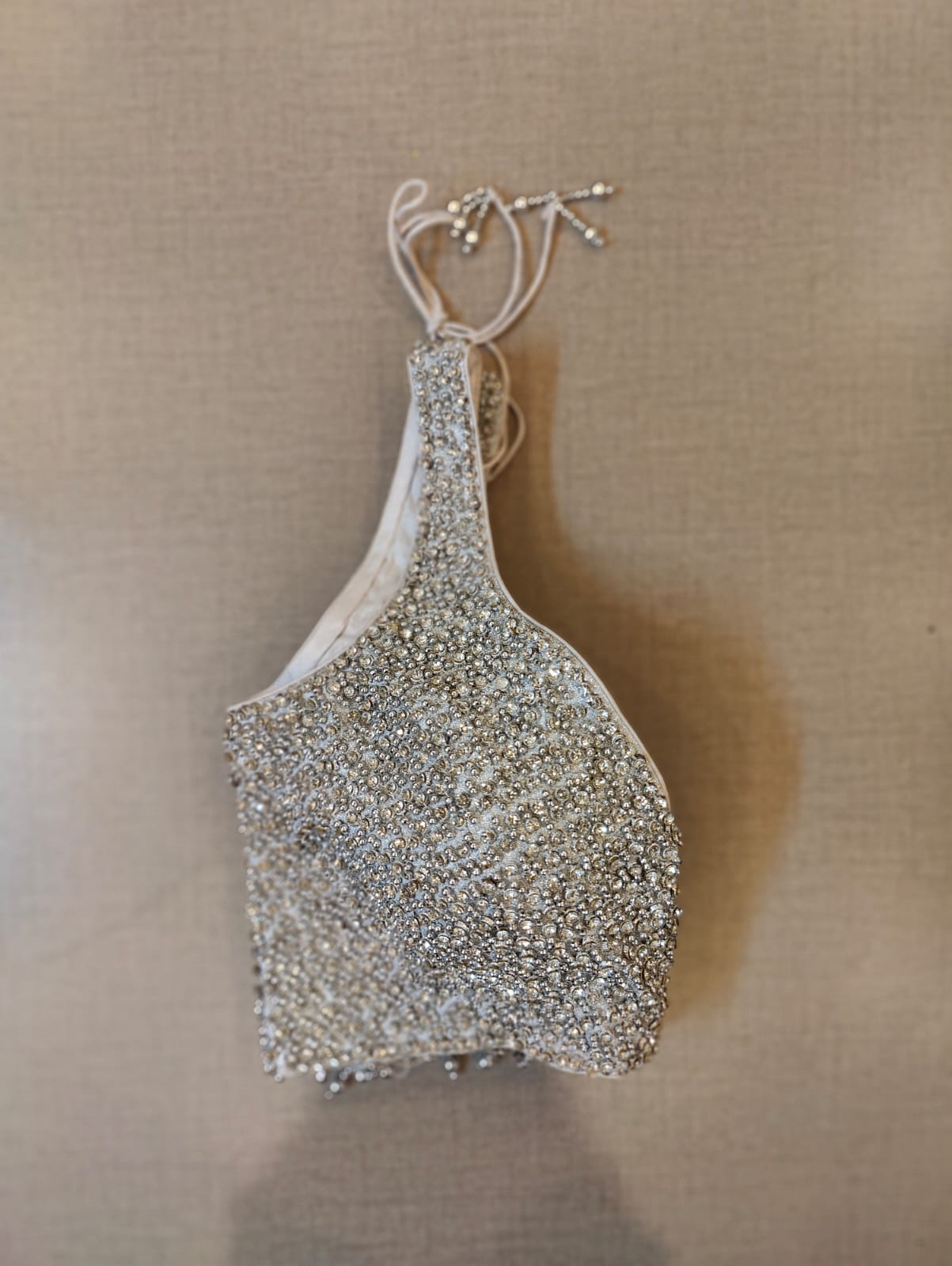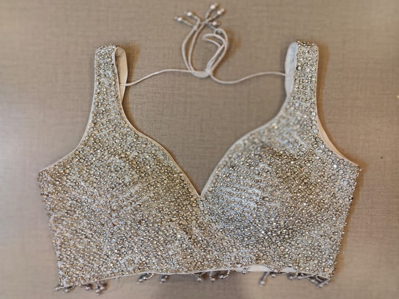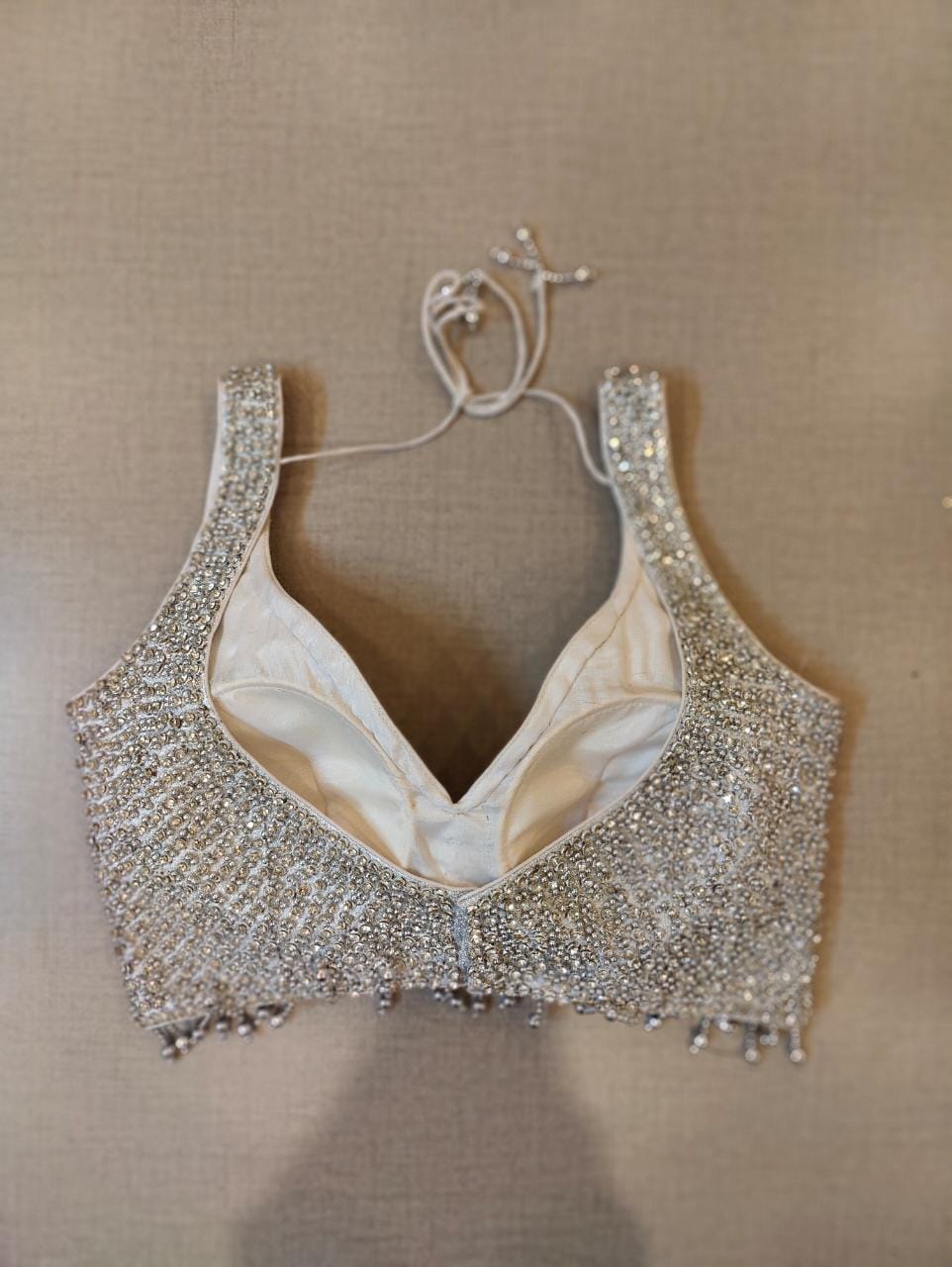 Tailored in a timeless hue and topped with elegant pearl & sequin details, this silver blouse is an evergreen addition to your festive wardrobe and party look. It is designed with a V neckline, sleeveless, and back hook closure with a tie-up. Buy this designer blouse in the USA from Pure Elegance.