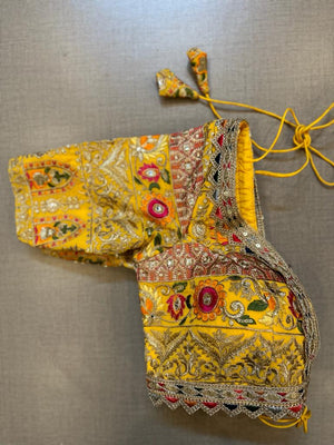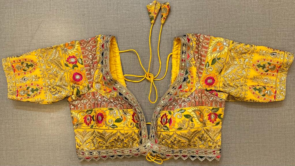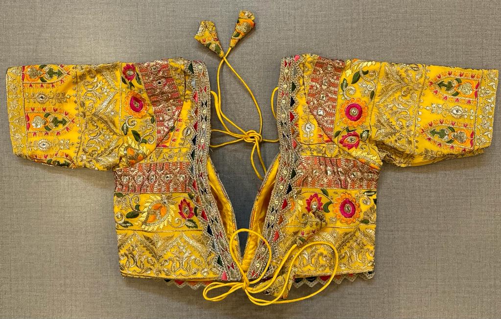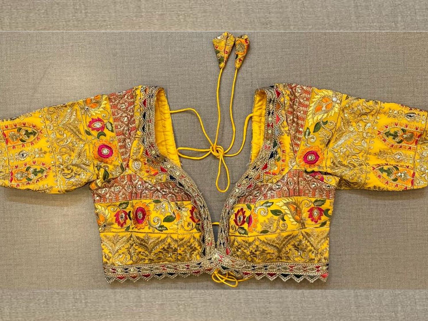 Tailored in a timeless hue and topped with floral embroidery details, this yellow blouse is an evergreen addition to your festive wardrobe and party look. It is designed with a neckline, 3/4th sleeves, and back hook closure. Buy this designer blouse in the USA from Pure Elegance.