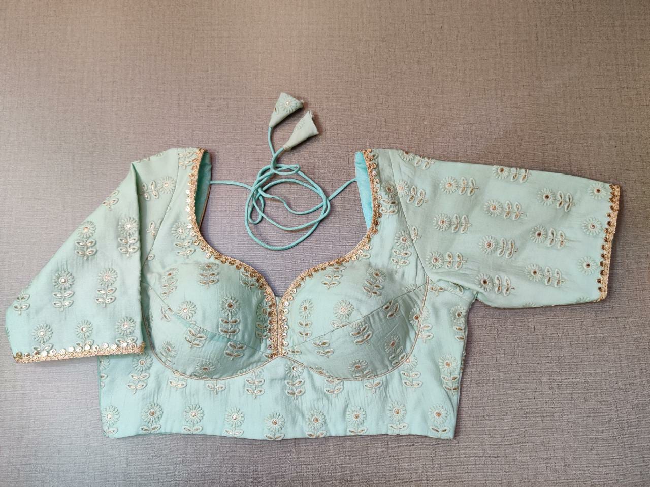 Blue-colored floral readymade saree blouse, has a beautiful flower embroidery, U shape neck, short sleeves, tie-up detail on the top back, and hook-and-eye closures at the back. Pair this beautiful blouse with a designer Bollywood saree to make your look elegant. Buy this designer blouse in the USA from Pure Elegance.