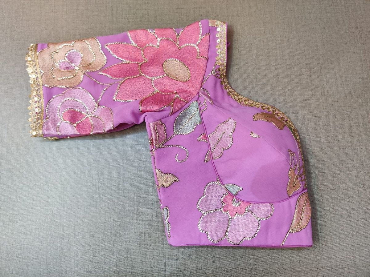 Lavender-colored floral readymade saree blouse, has a round neck, short sleeves, tie-up detail on the top back, and hook-and-eye closures at the back. Pair this beautiful blouse with a designer Bollywood saree to make your look elegant. Buy this designer blouse in the USA from Pure Elegance.
