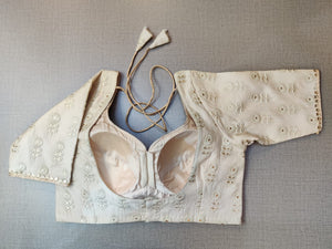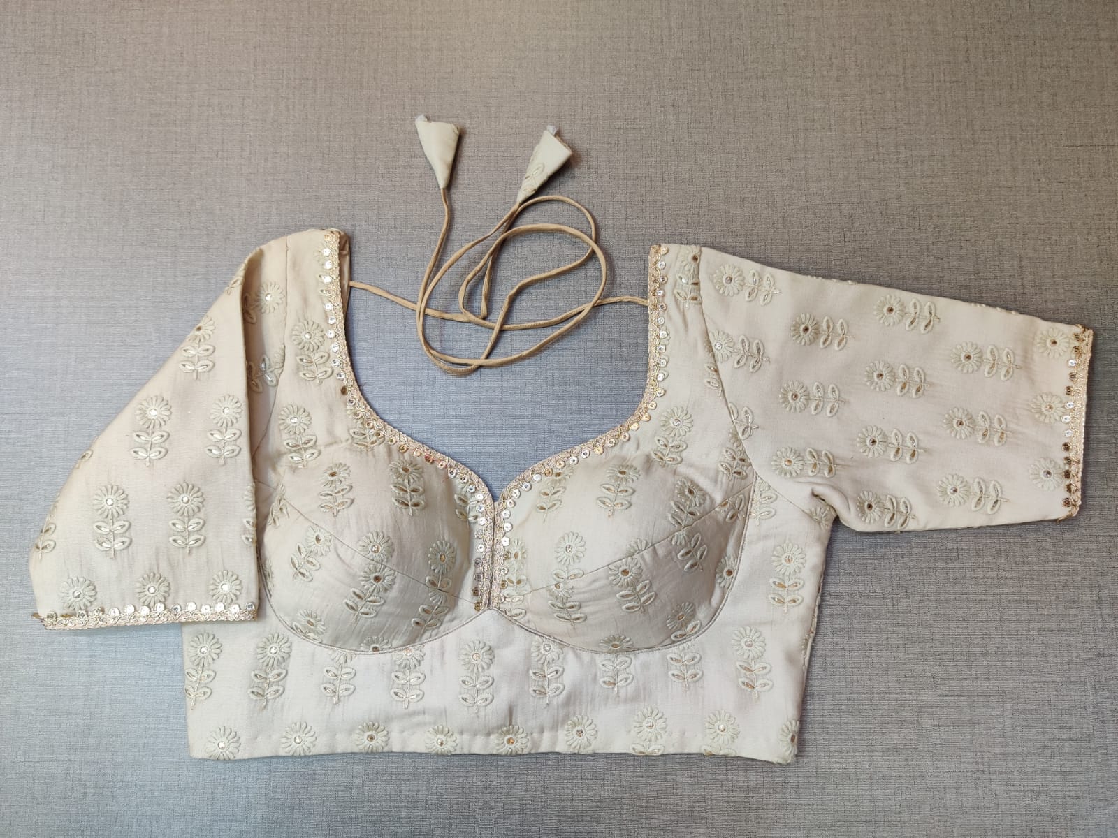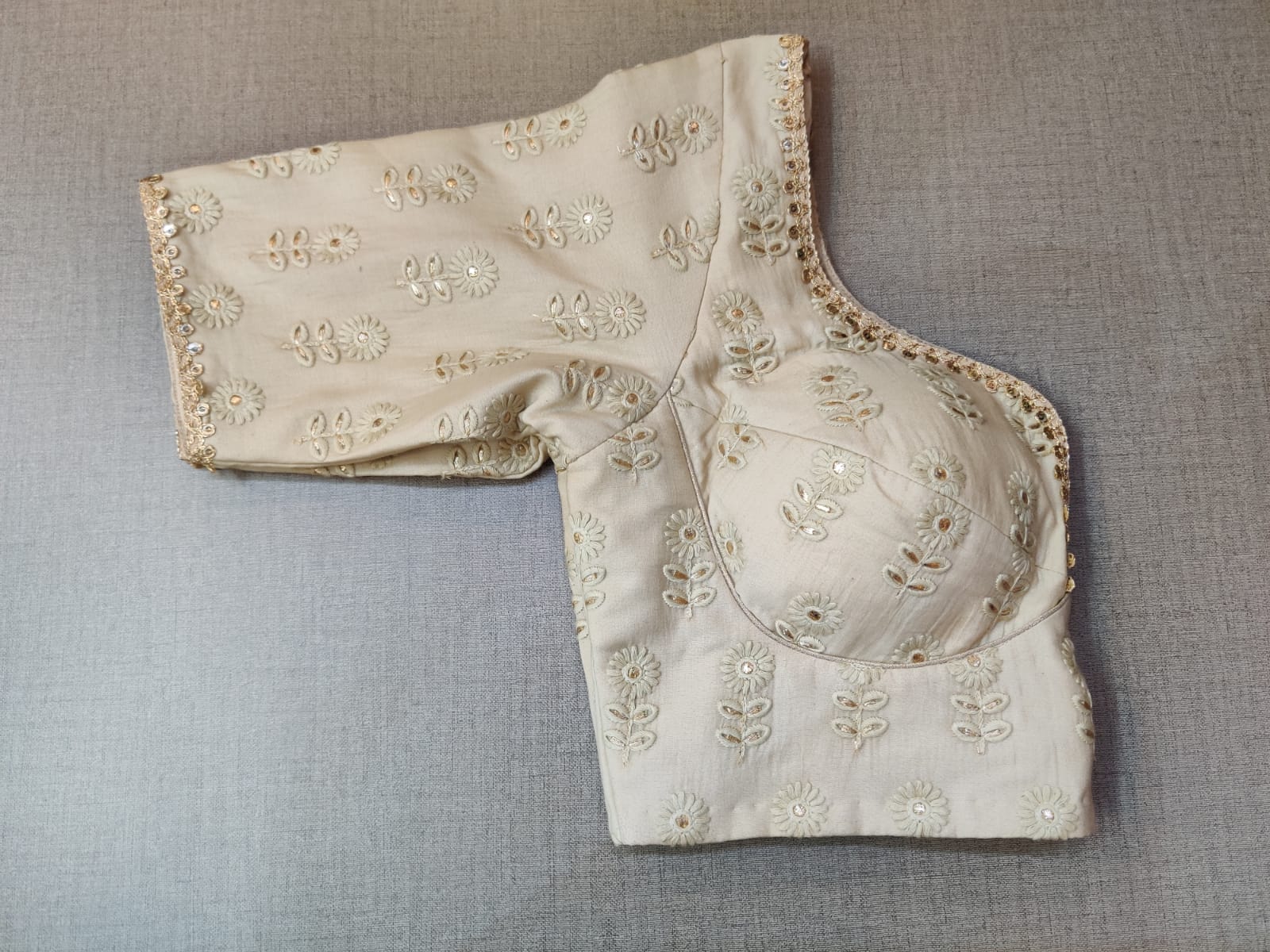 Off-white-colored floral readymade saree blouse, has a beautiful flower embroidery, U shape neck, short sleeves, tie-up detail on the top back, and hook-and-eye closures at the back. Pair this beautiful blouse with a designer Bollywood saree to make your look elegant. Buy this designer blouse in the USA from Pure Elegance.