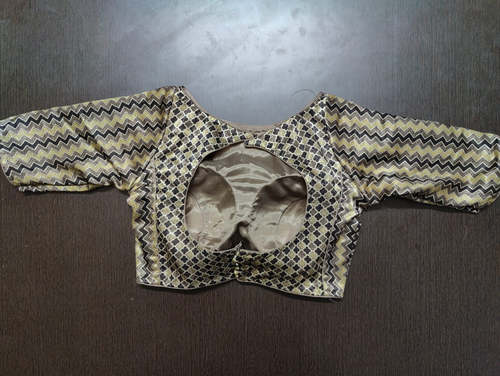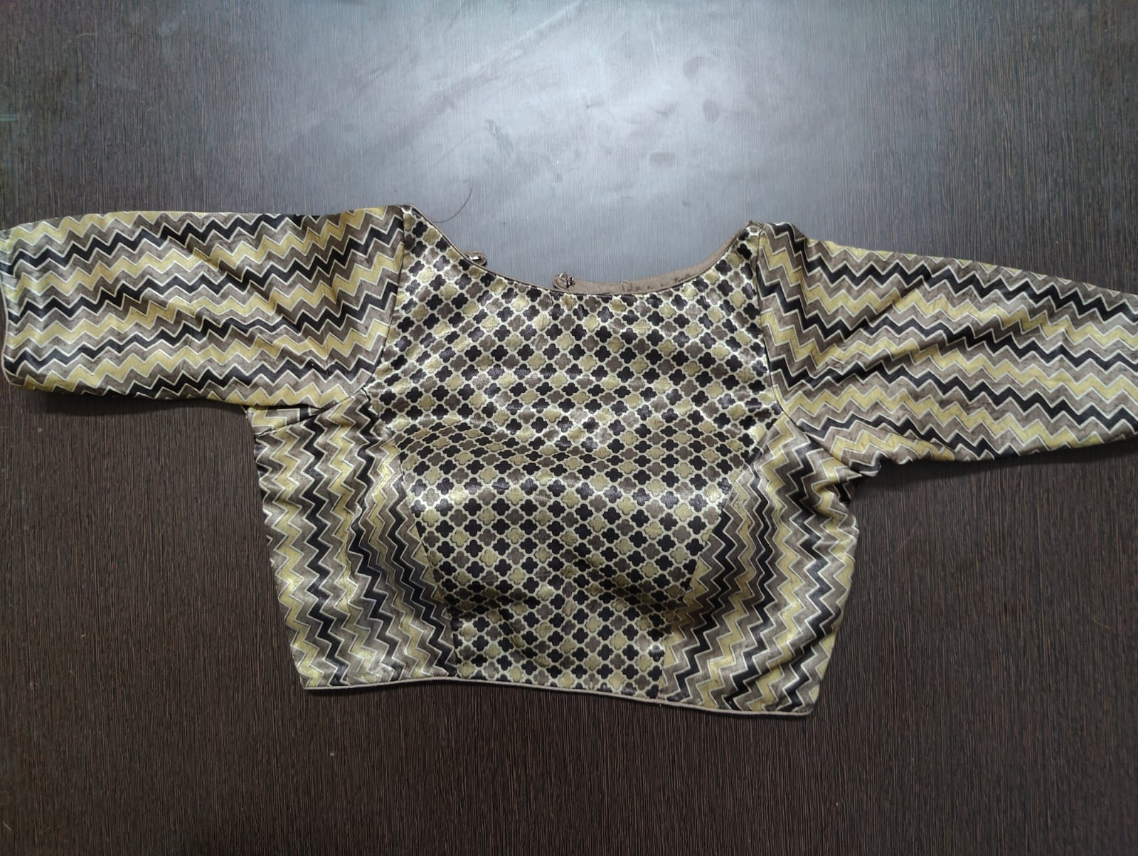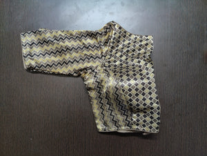 Gold-colored silk saree blouse, padded, has a boat neck, short sleeves, styled back, hook and eye closure. Pair this silk printed blouse with any Indian silk saree to have an elegant look. Buy this designer blouse in USA from Pure Elegance.